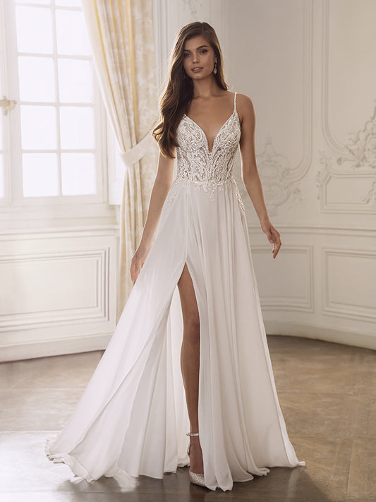 For the bride who loves cutting-edge fashion. Pairs perfectly with our Modern Jewelry & Headpieces. Ideal dresses for guests attending Modern & Contemporary or Dramatic & Sexy weddings.- While laid back bohemian dresses or timeless cathedral dresses appeal to some, for the more contemporary bride, clean, simple, minimalist designs offering more structure are the name of the game. While modern dresses tend to be simple in design, there are still lots of different styles and options to choose from. Your wedding is unique, as are you, so your Ma Chérie Bleue Wedding dresses stylist will work with you to determine what styles, cuts, designs, flourishes, and details will be best suited to your big day. Be ready to walk down the aisle feeling chic, elegant, and glamorous in a modern wedding dress.