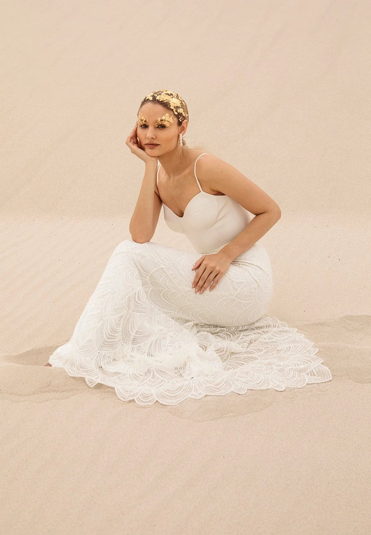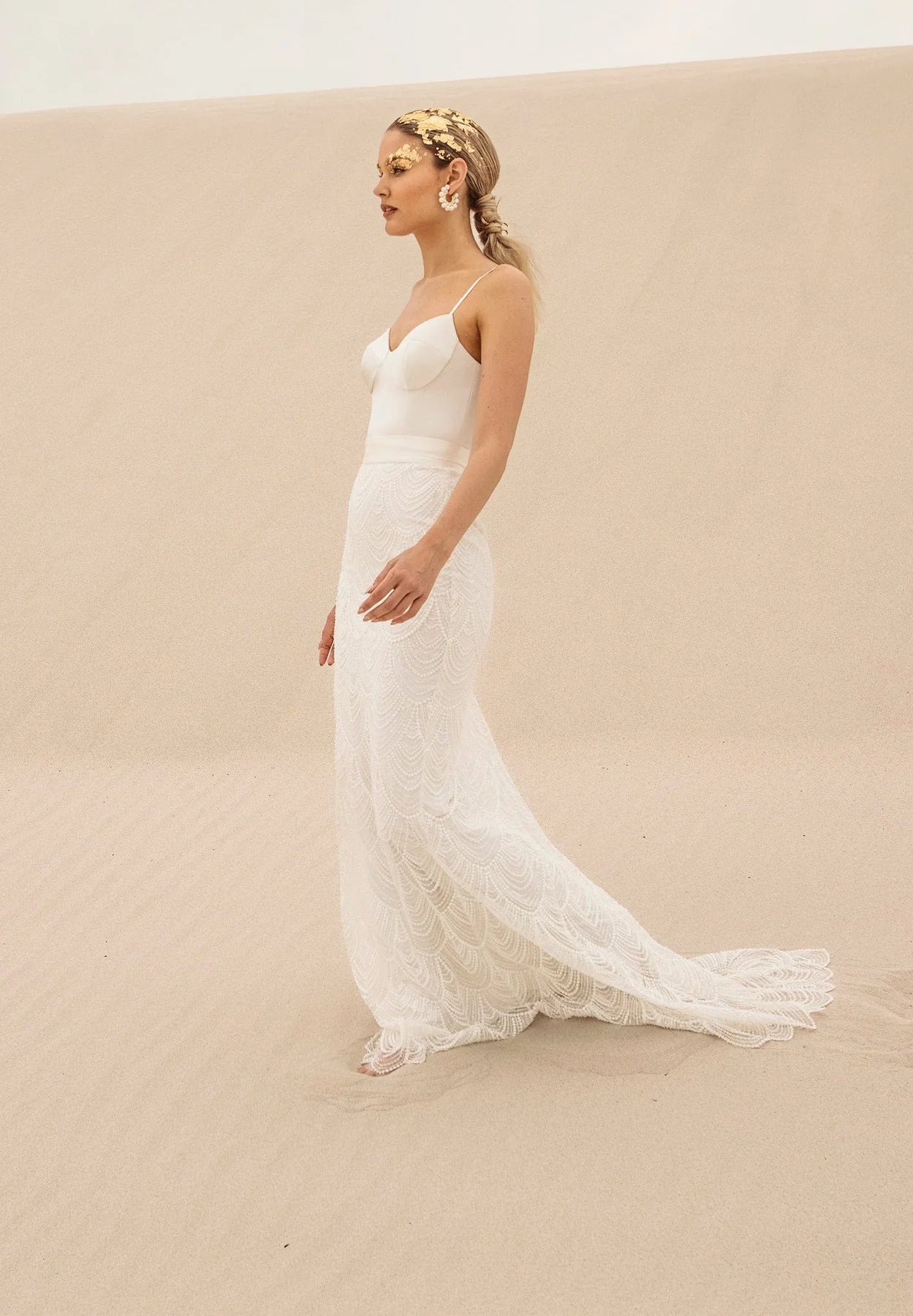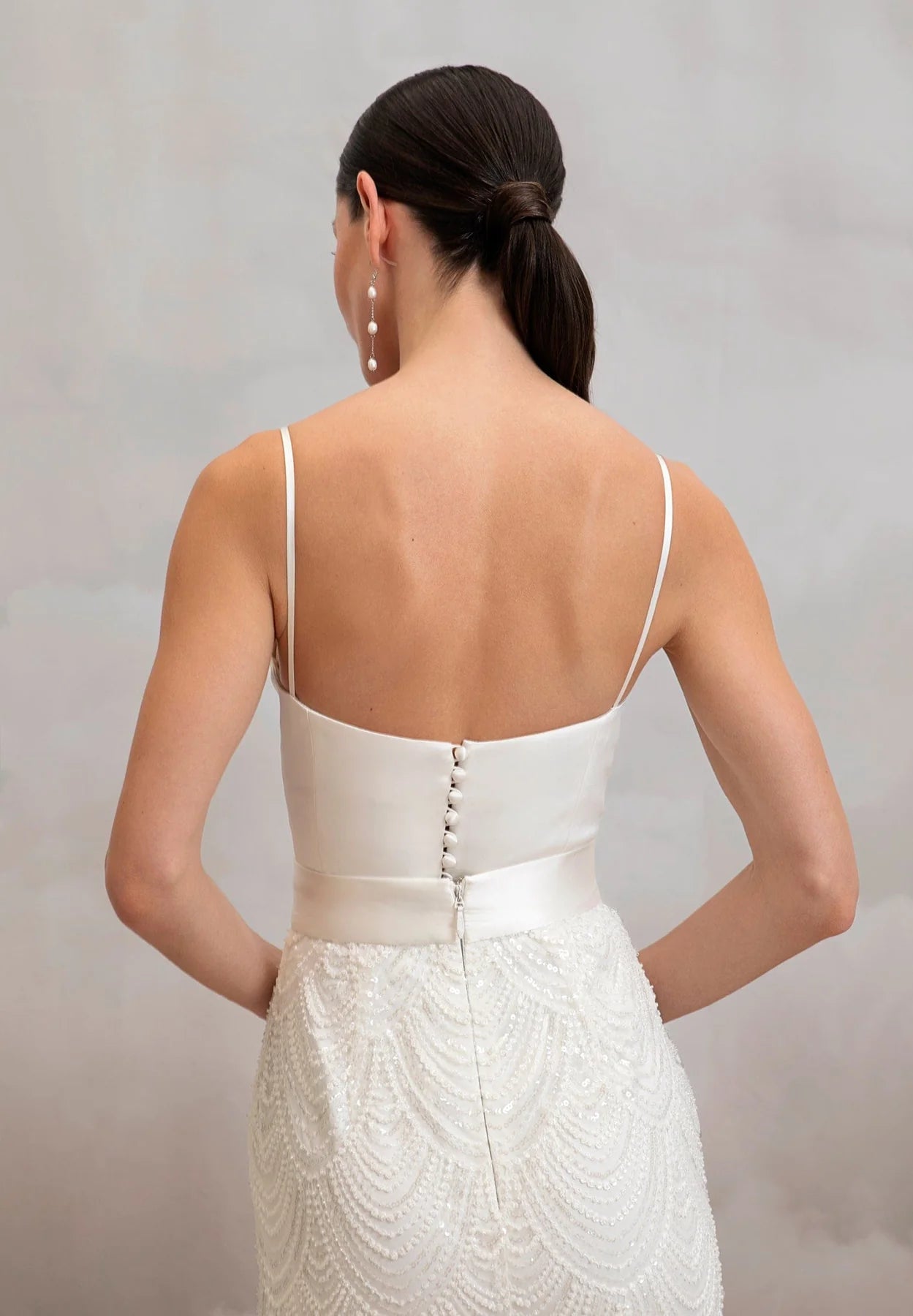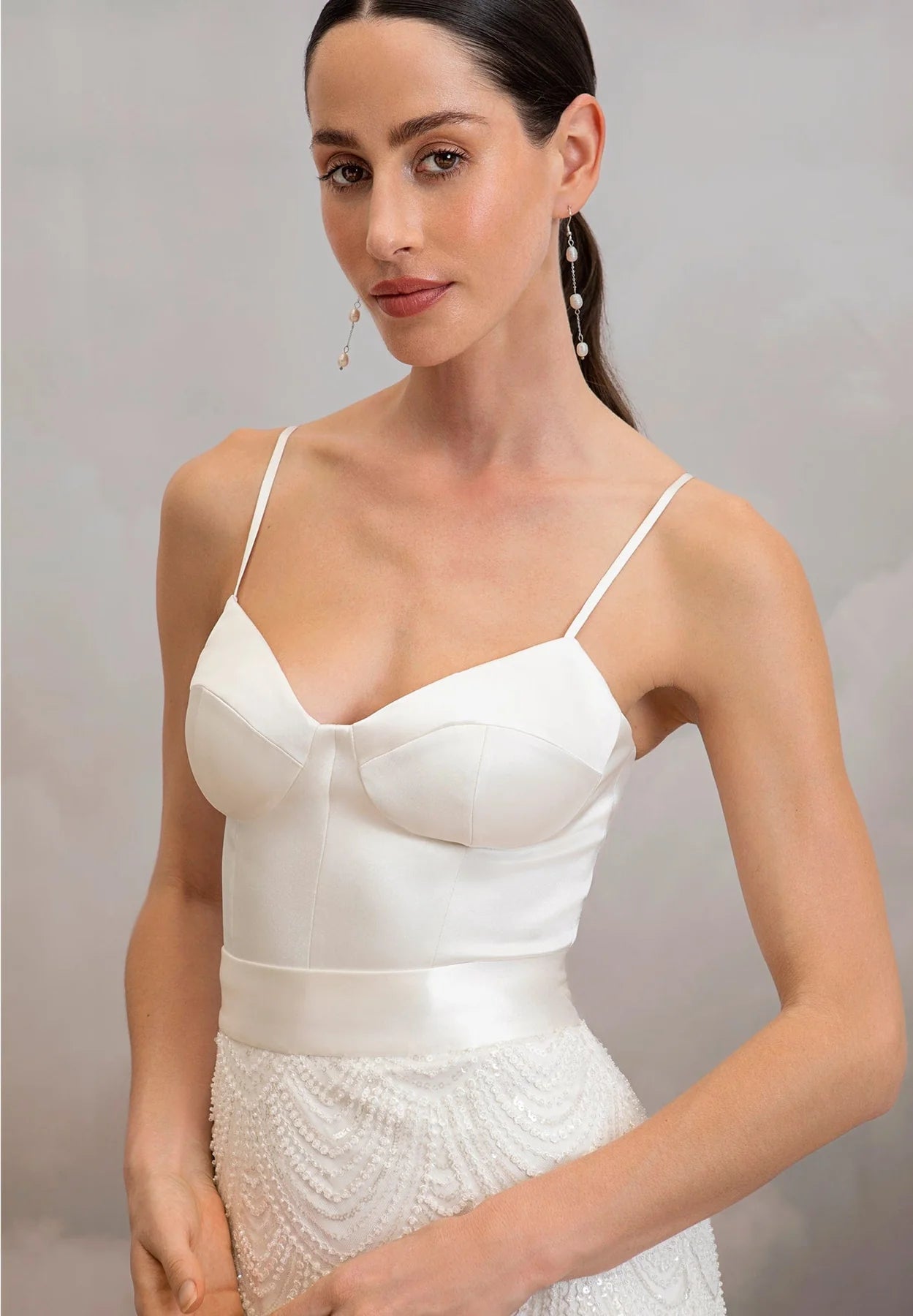 The Alea Bodice is an elegant bustier-style piece crafted from rich bridal ivory heavy satin. Designed with built-in bust cups and structured boned seams, it provides brides with versatile styling possibilities. Slim silk satin straps and a gently rounded back create a secure, flattering fit. The back closes with a delicate line of satin-covered buttons for a refined finish.