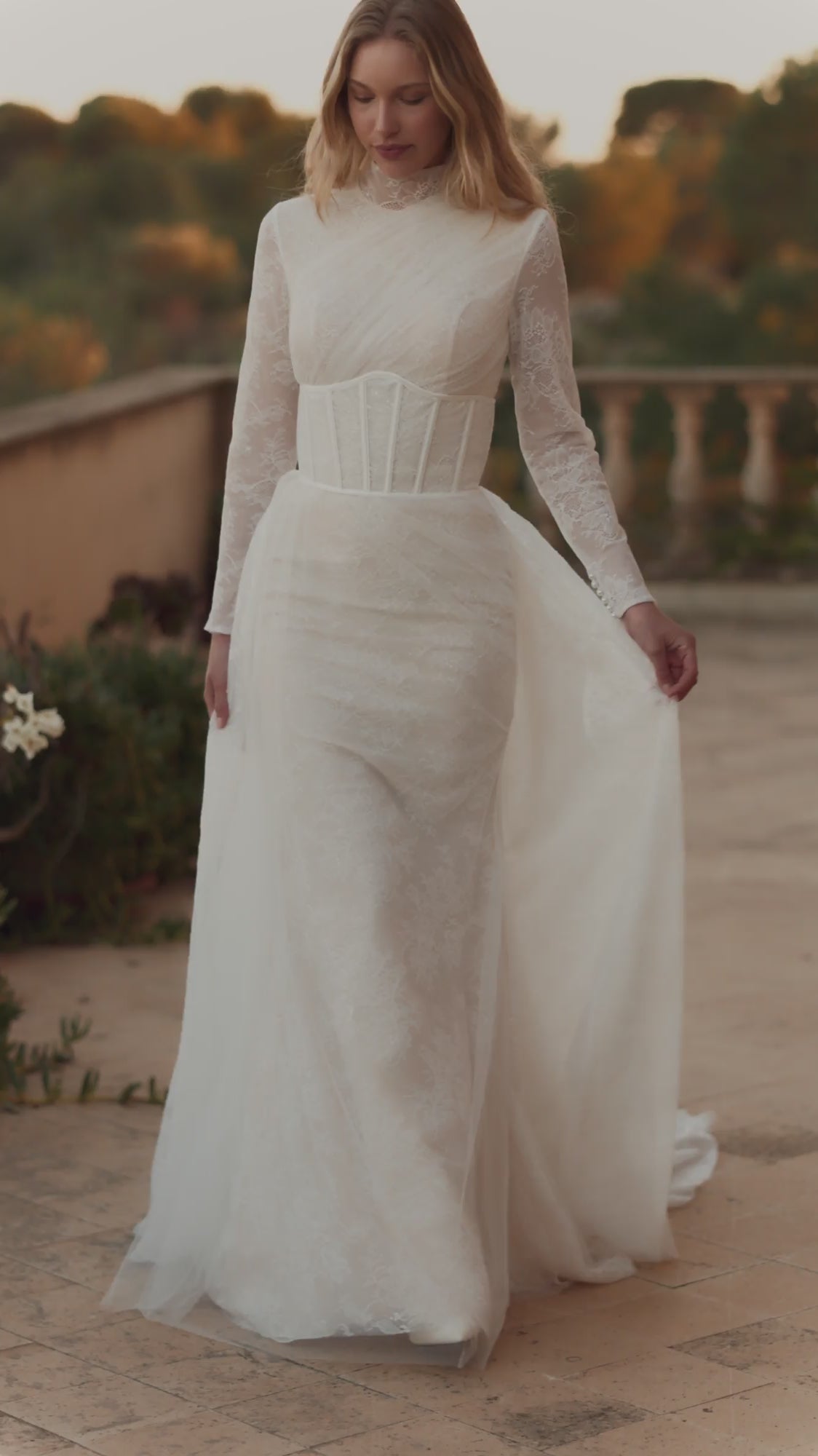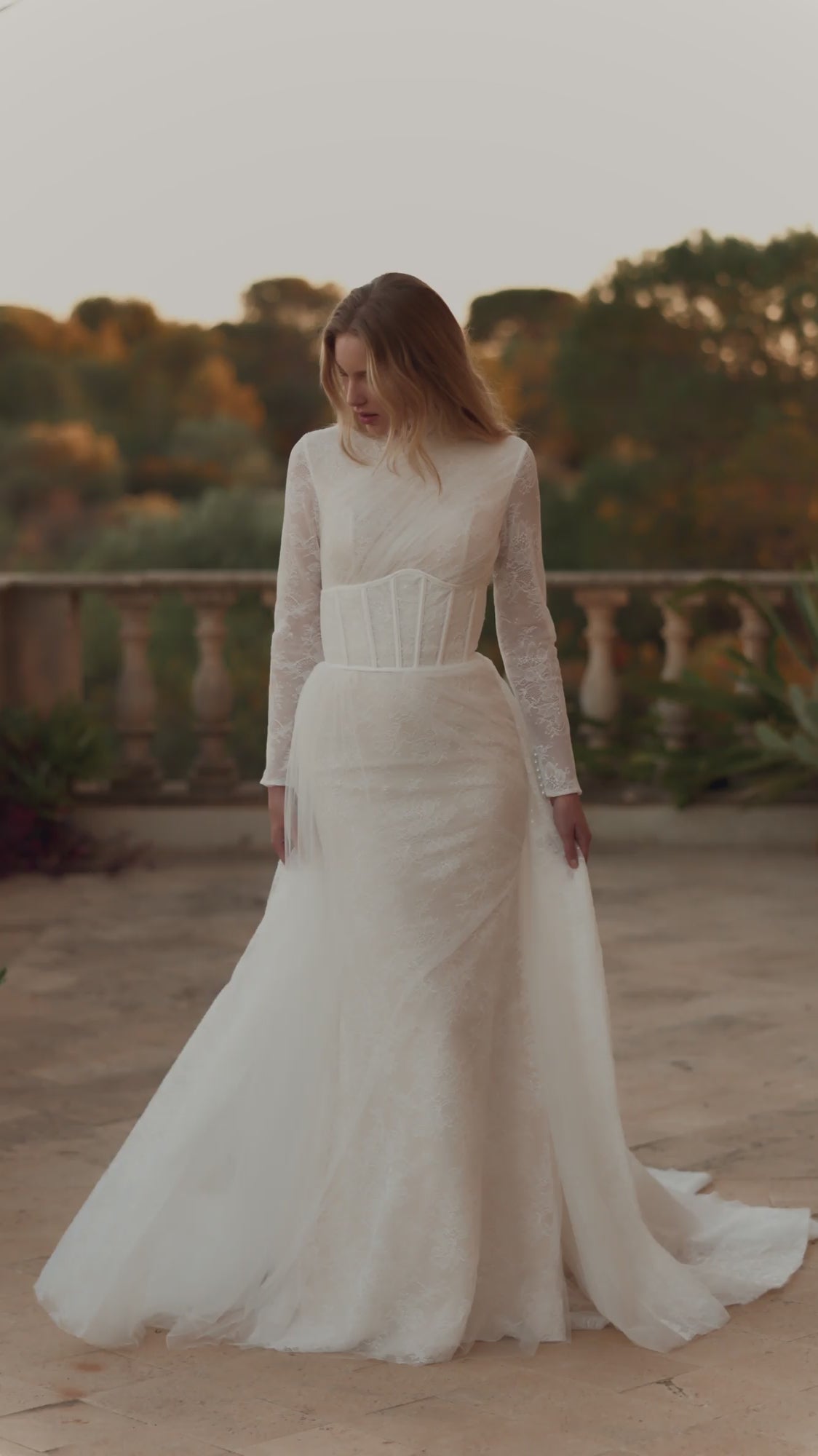 The original style of the fishtail dress in lightskin color, constructed of delicate lace, is the ideal choice if the bride is searching for something both unique and timeless. The lace corset features a stand-up collar. The upper portion of the corset's back is shaped like a "drop," and the space between the shoulder blades and the waist is exposed. Loops and buttons secure the corset in the middle of the back. Chaotic mesh pleats adorn the corset, which has long lace sleeves sewed on. A lace skirt with an exquisite train and a tight fit around the hips. It is secured with a concealed zipper in the middle of the rear panel. There is also an ivory version of this dress.