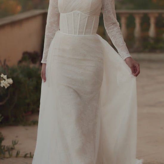 An ivory, detachable skirt. This semi-transparent skirt features a broad "corset" belt adorned with satin stripes and is composed of tulle and lace. The skirt is secured with a concealed zipper, while the corset has a hook-and-eye fastening.