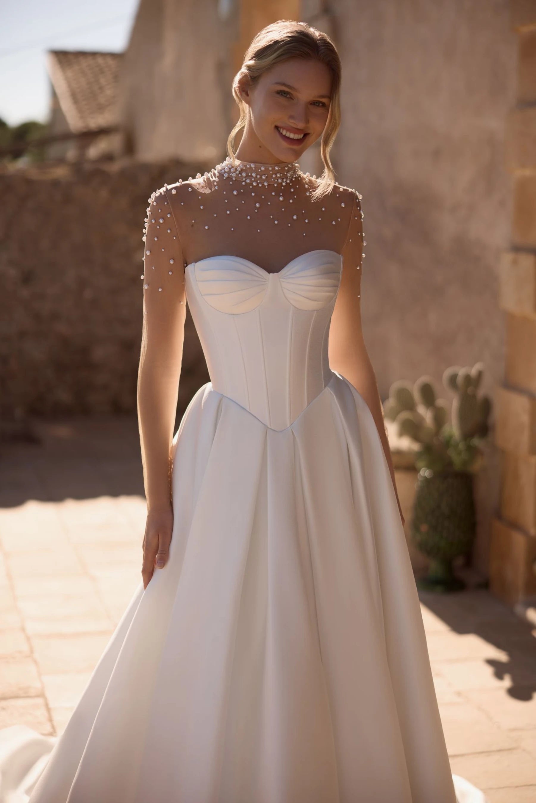 The extremely delicate and almost invisible bolero is made of mesh, with long sleeves and a stand-up collar. The bolero is decorated with embroidered pearls of different shapes. The back is fastened with loops and buttons. This bolero is also available in ivory color.