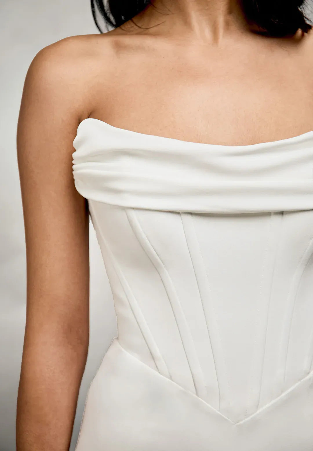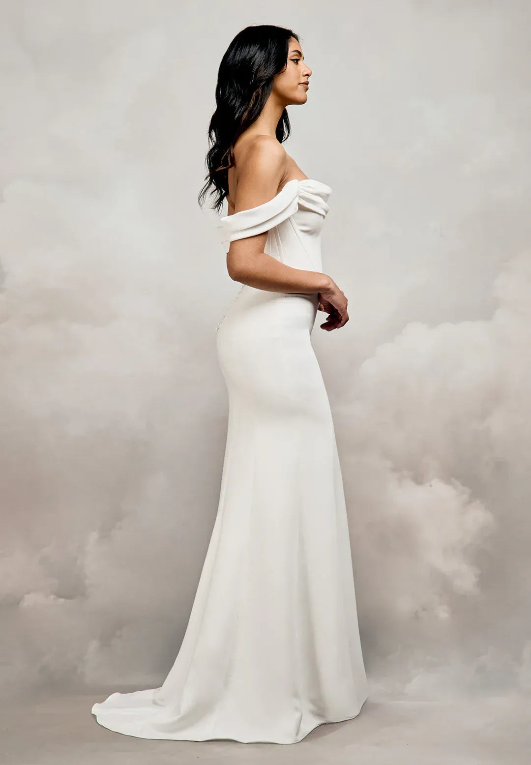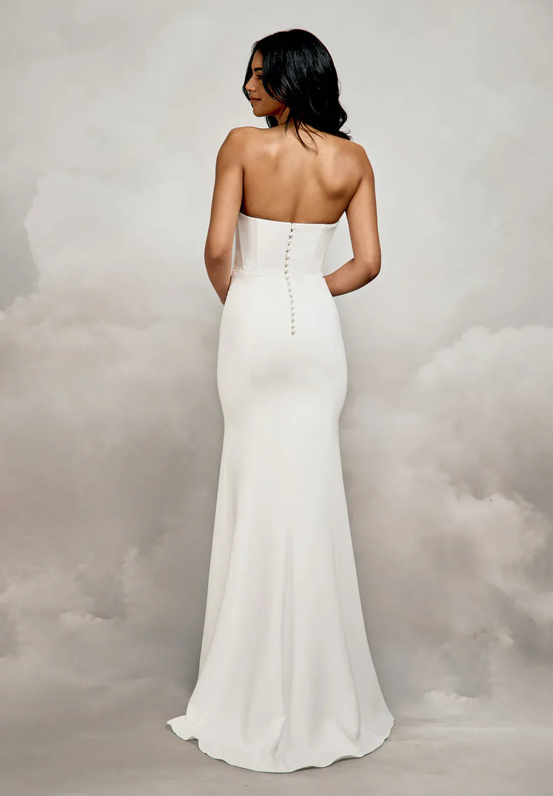 The full-length Cassidy Gown is a modern take on bridal fashion and is made for brides who like clean lines and styles that can be worn in many ways. This dress is made from rich, sumptuous crepe and lined with eco satin. It gives you a sculpted shape. The strapless bodice is meticulously boned for stability. It has a modern scooped neckline and a V-shaped basque waist seam that pulls in and lengthens the form. The bodice has strong support built in, so you don't need to wear extra underwear. Her skirt has a fit-and-flare shape with a thigh-high split on the left side that shows a little bit of leg. The controllable train adds a touch of drama without making the silhouette too busy. Cassidy comes with two heavy crepe embellishments that can be taken off: a front draped cowl neckline and off-the-shoulder drapes that can be taken off. These change the style from elegant and simple to romantic and expressive. Brides can easily change their style throughout the day with these removable parts. There is a hidden zip on the back that is covered with buttons made of crepe.
