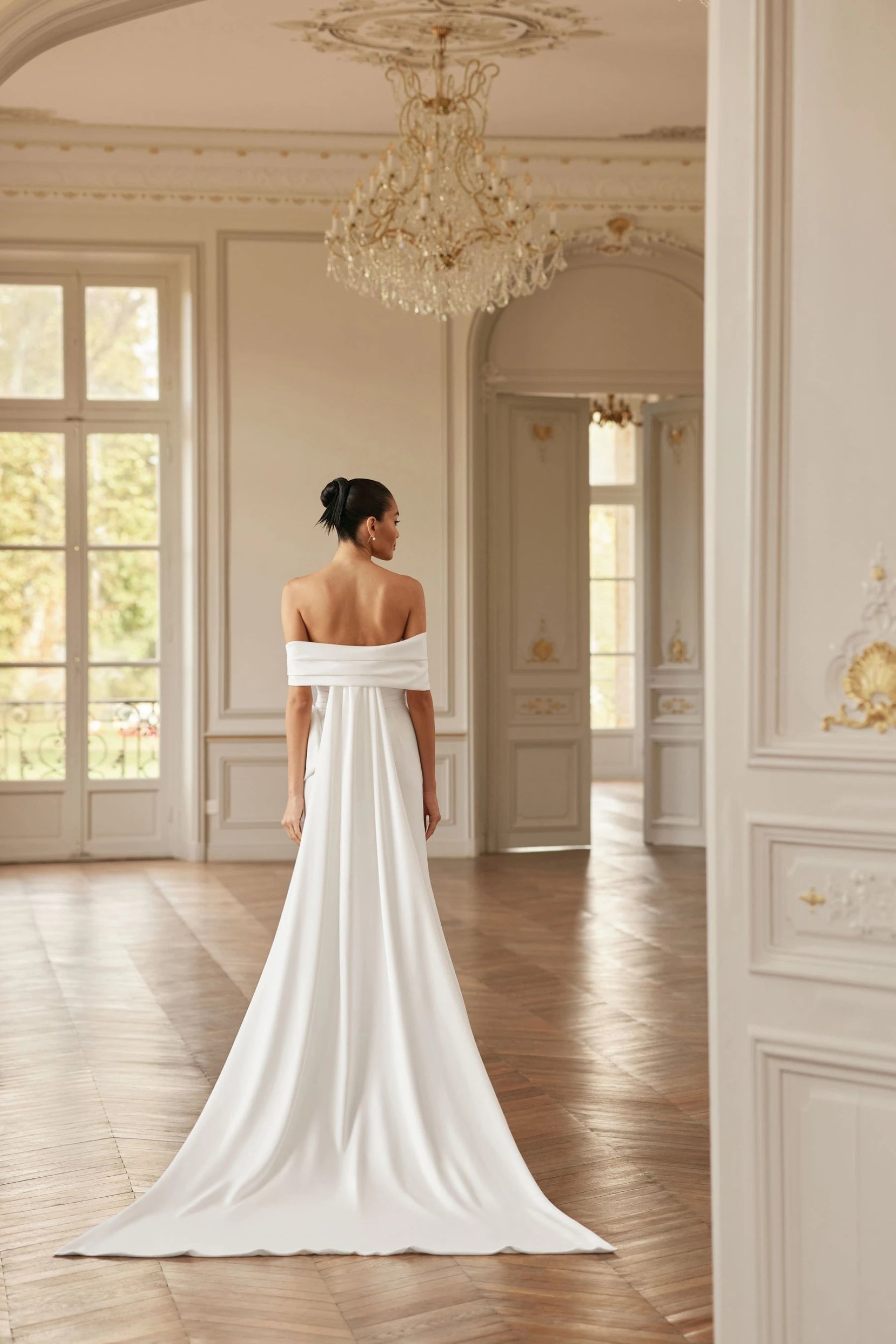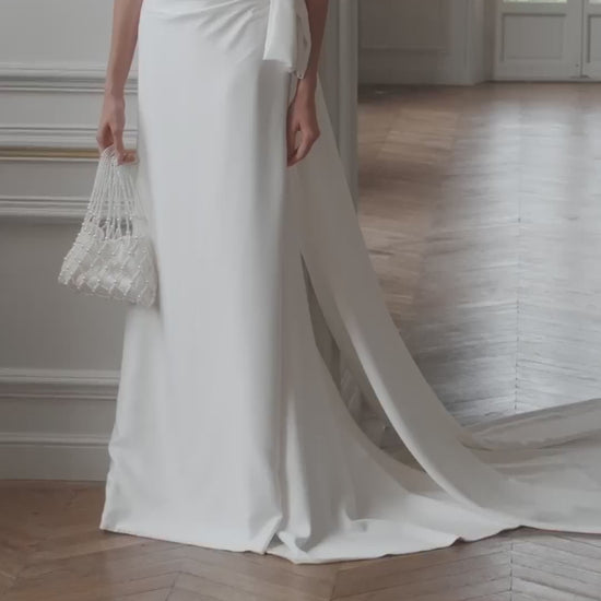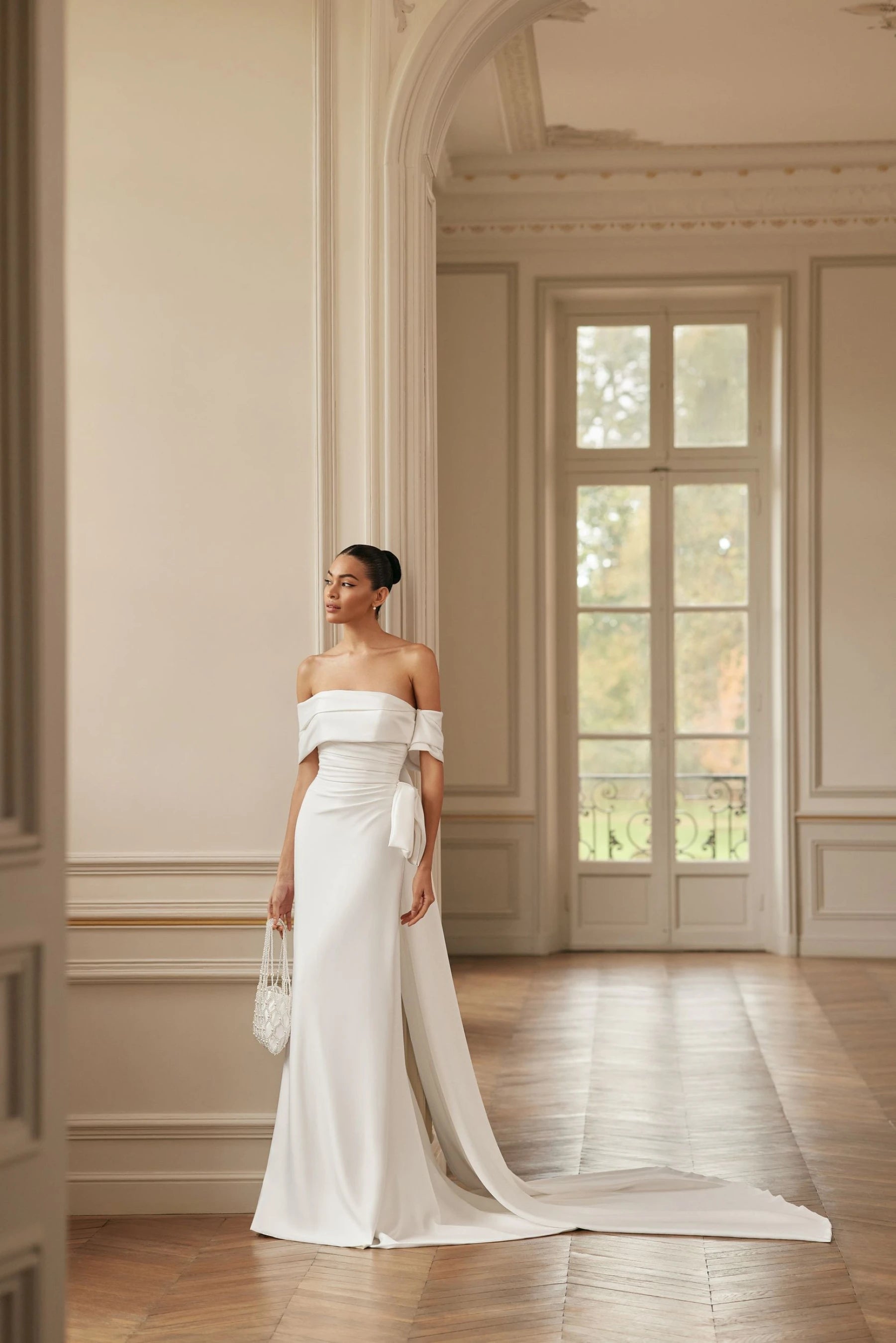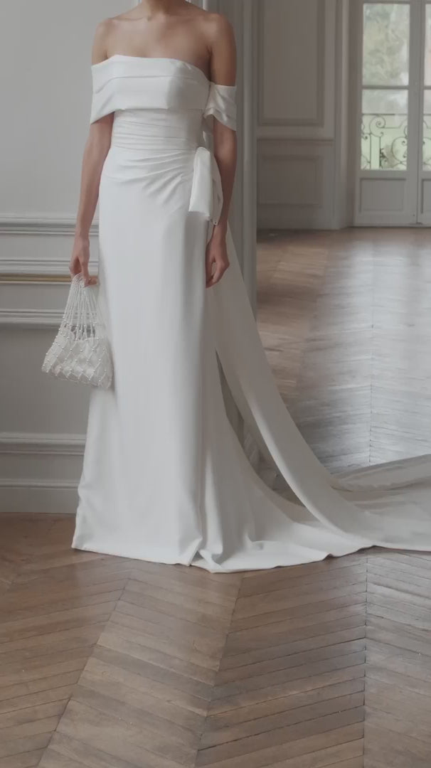 An ivory costume fabric dress with a mermaid silhouette can help you showcase your elegance, charisma, and tasteful sense of style. Wide horizontal folds adorn the dress's corset, which has an even contour. A slim form and delicate shoulders will accentuate the straight-shaped dress's back, which starts below the shoulder blades. Expander hooks are used to secure the corset. Buttons are used to secure a draped yoke to the dress. It produces asymmetry and serves as wing sleeves. An attractive appeal is provided by a close-fitting skirt with a train, the front panel of which has diagonal pleats that emerge from the side seam. A concealed zipper serves as the skirt's fastening. A detachable ornamental element on the back and a detachable bow on the left side of the garment nicely enhance the image.
