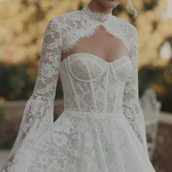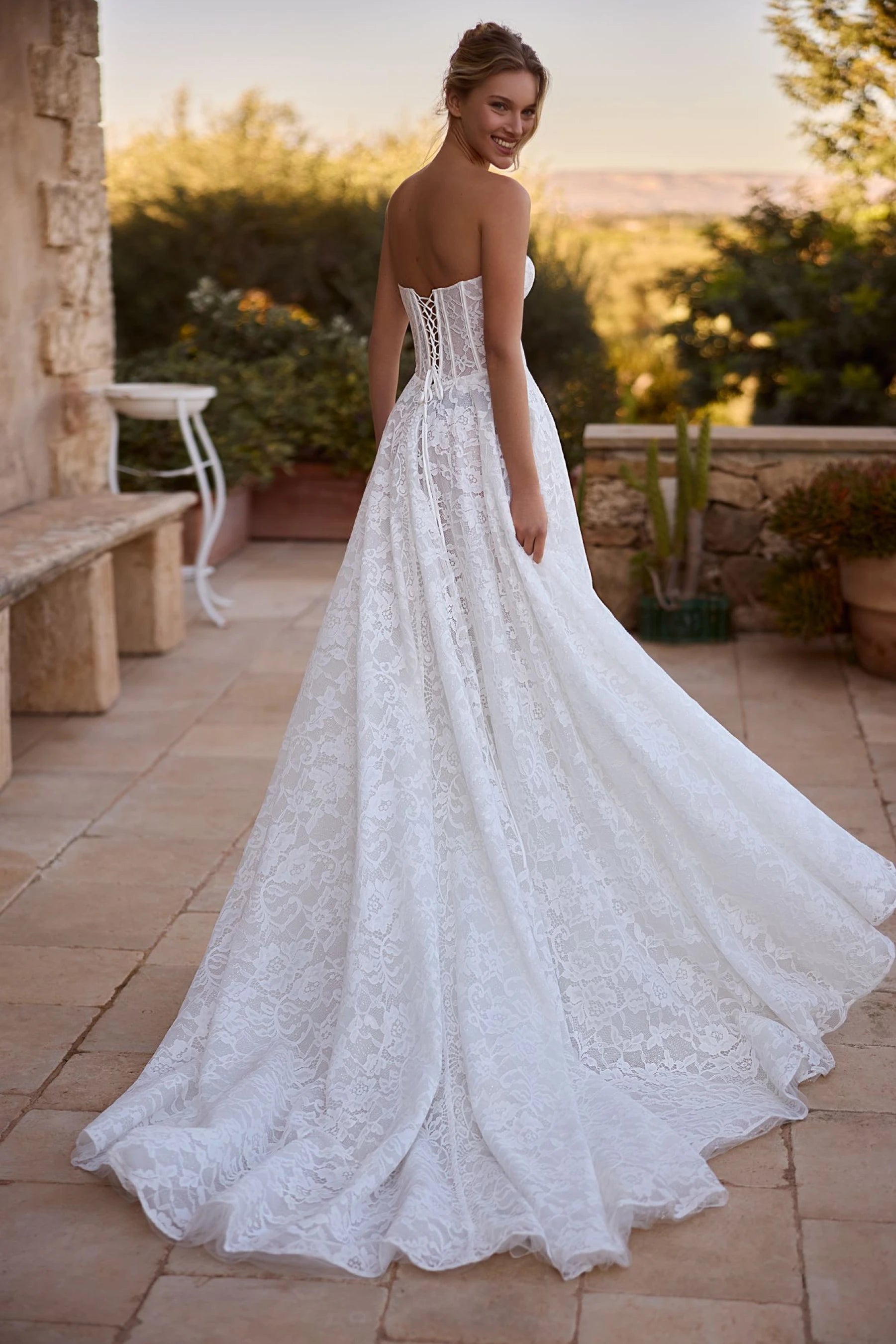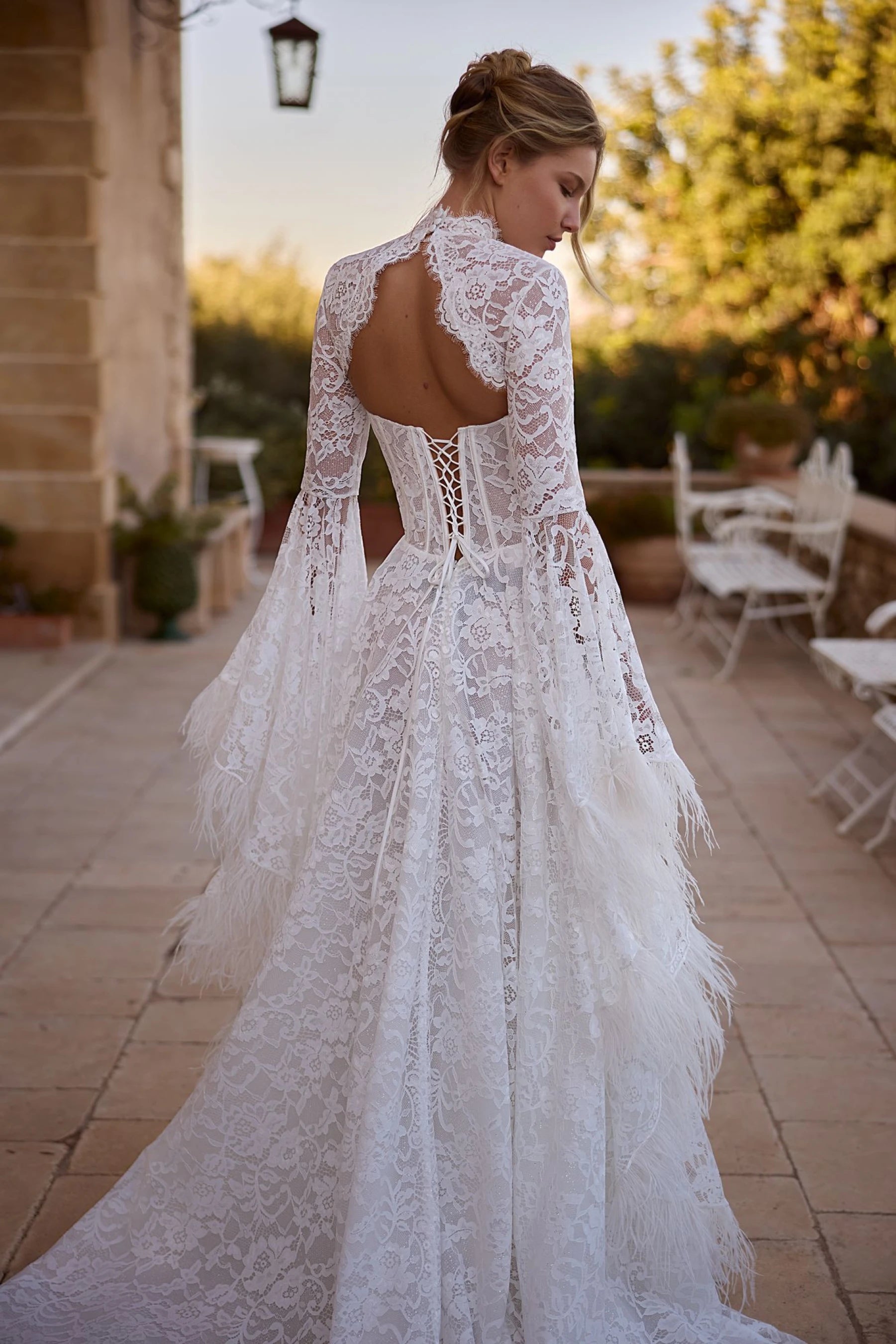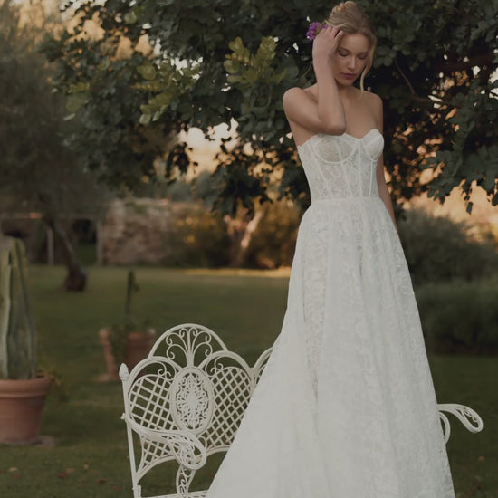 The bride will feel airy lightness and unrestrained freedom of movement in this A-line dress in ivory color. The corset of the dress is translucent and made of delicate lace. The back of the corset is slightly concave at the level of the shoulder blades, with a lace-up closure. The translucent puffy skirt with a luxurious airy train is made of lace and several layers of mesh. The back is fastened in the center with a hidden zipper. This dress is available in lightskin color and with a hook-and-eye closure.