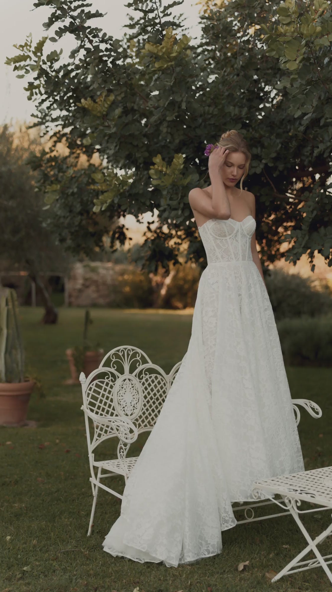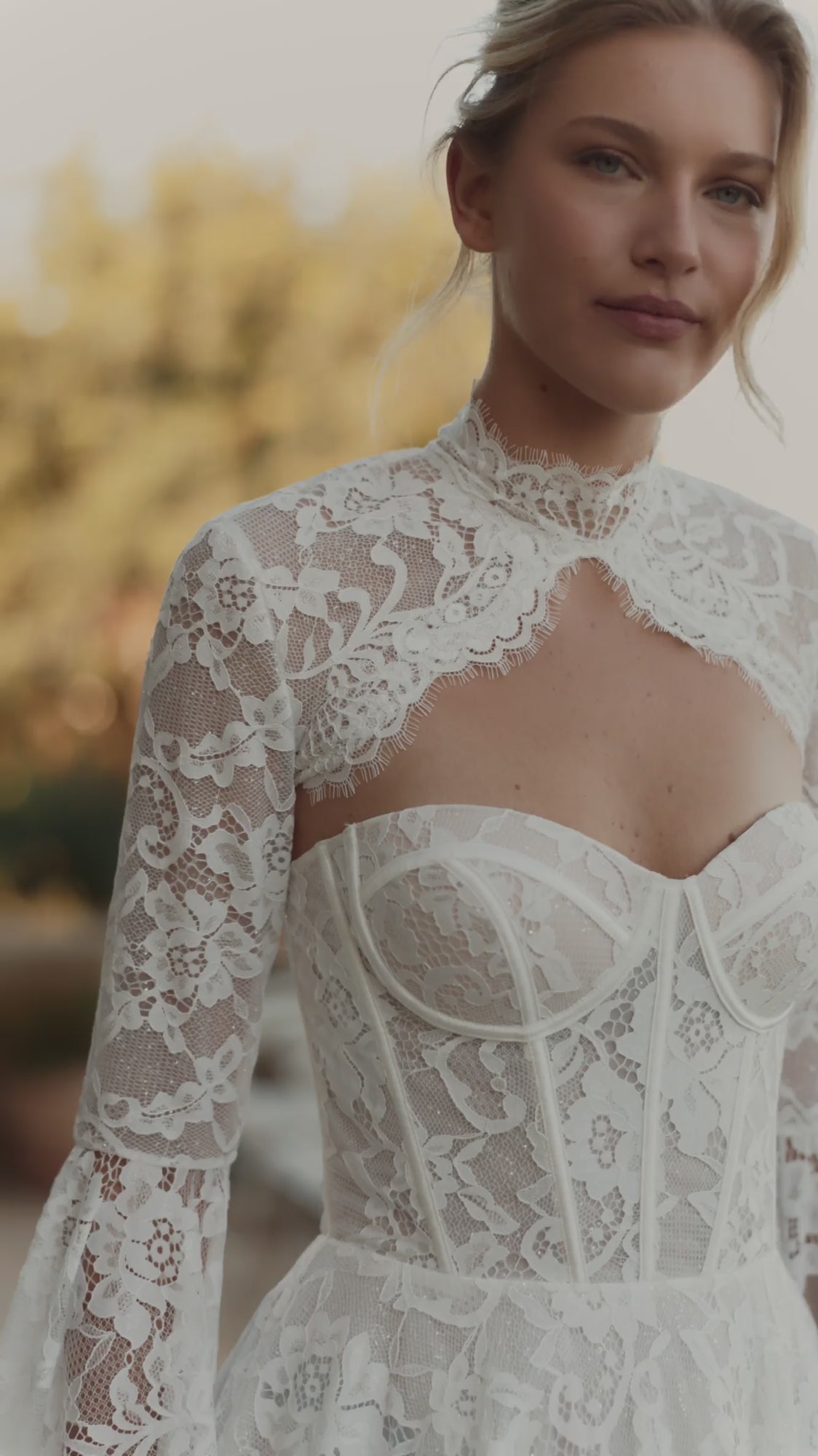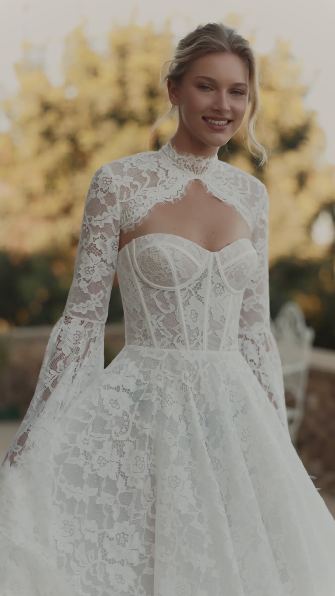 The bride will feel airy lightness and unrestrained freedom of movement in this A-line dress in ivory color. The corset of the dress is translucent and made of delicate lace. The back of the corset is slightly concave at the level of the shoulder blades, with a lace-up closure. The translucent puffy skirt with a luxurious airy train is made of lace and several layers of mesh. The back is fastened in the center with a hidden zipper. This dress is available in lightskin color and with a hook-and-eye closure.