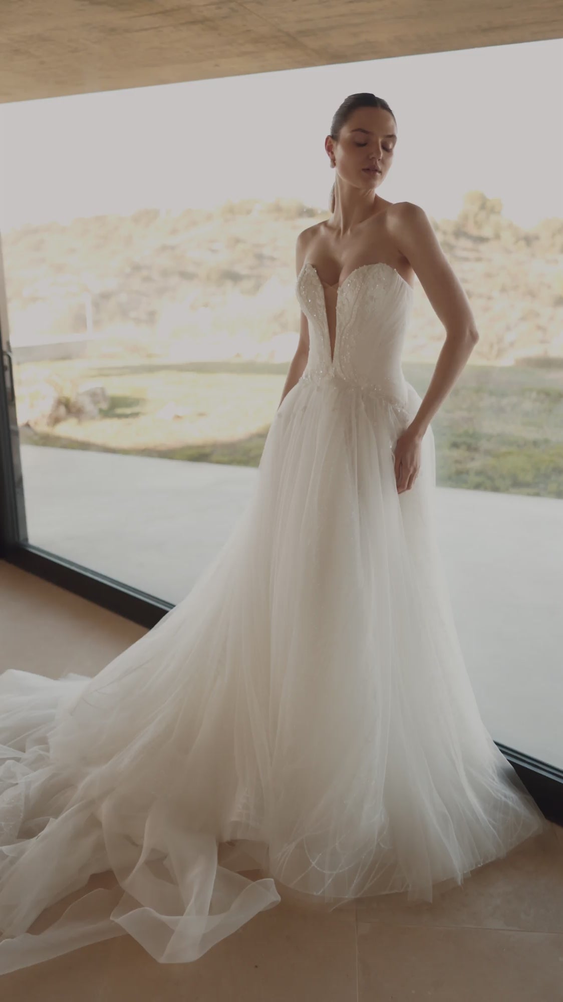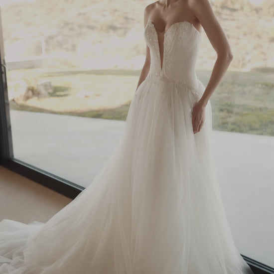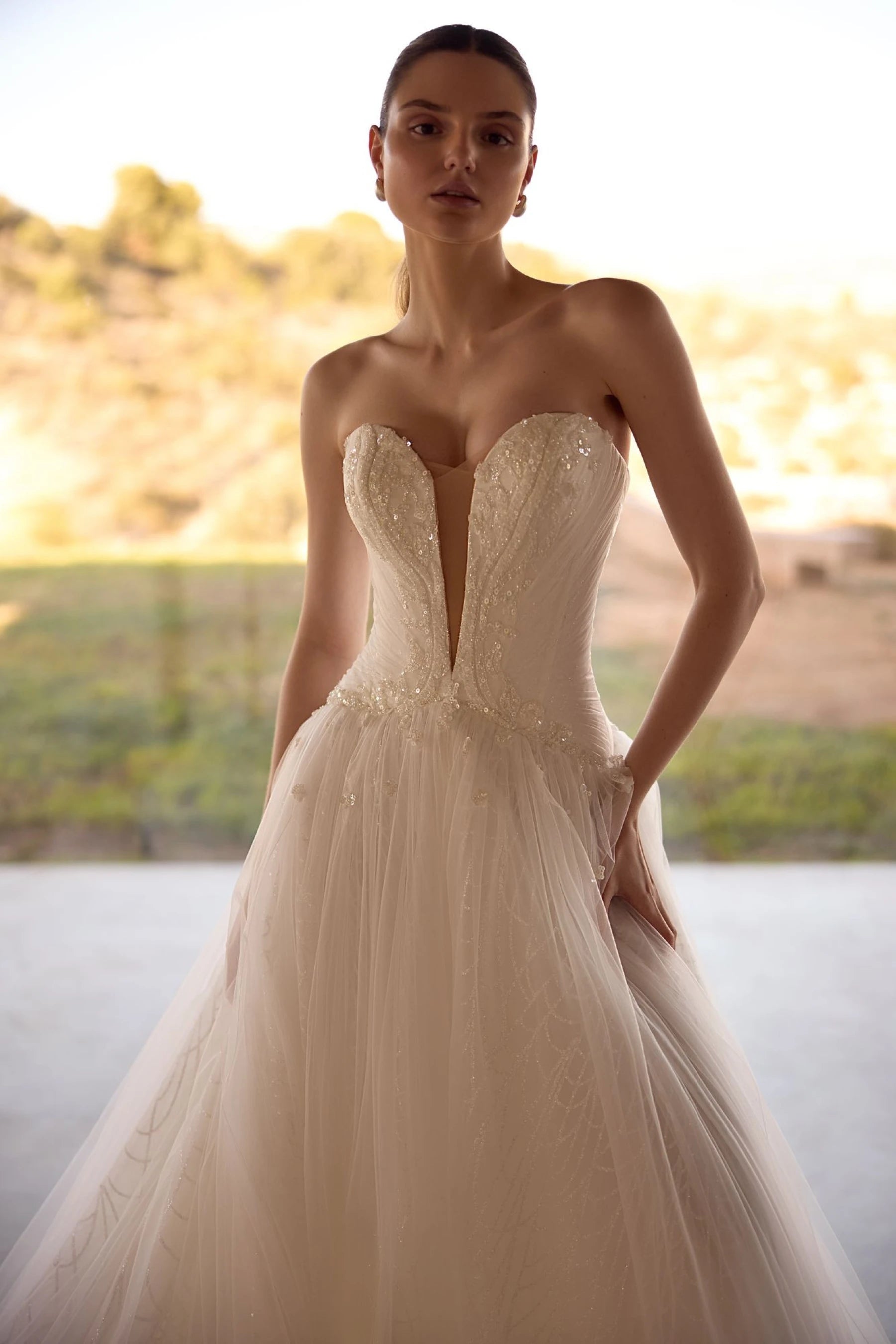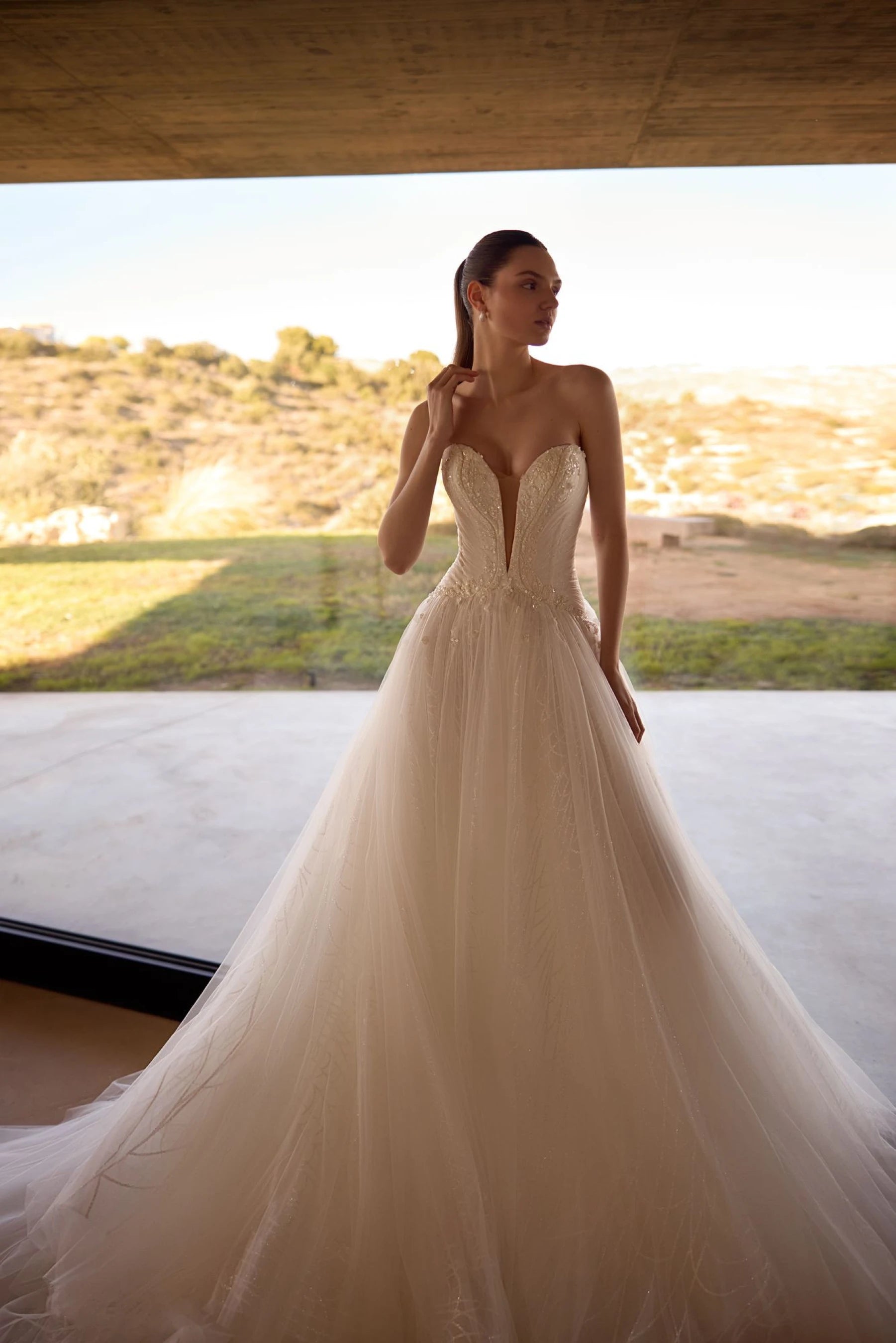 An alluring, gentle, irrepressible and dreamy bride should choose this wedding dress, an A-line dress in ivory color. The corset is made with a V-neckline and a curly sewing line of the skirt, which visually narrows the waistline. The back is slightly concave and reaches the level of the shoulder blades. The top is fastened with extension hooks. The corset is decorated with embroidered appliqués and diagonal mesh drapery, through which you can see the textured shine. The puffy skirt has a luxurious train. The top layer of tulle is slightly decorated with embroidered floral appliqués. The skirt is made using a textured gloss, which is covered with a layer of tulle. This dress is possible in the version without using textured glitter in the skirt.