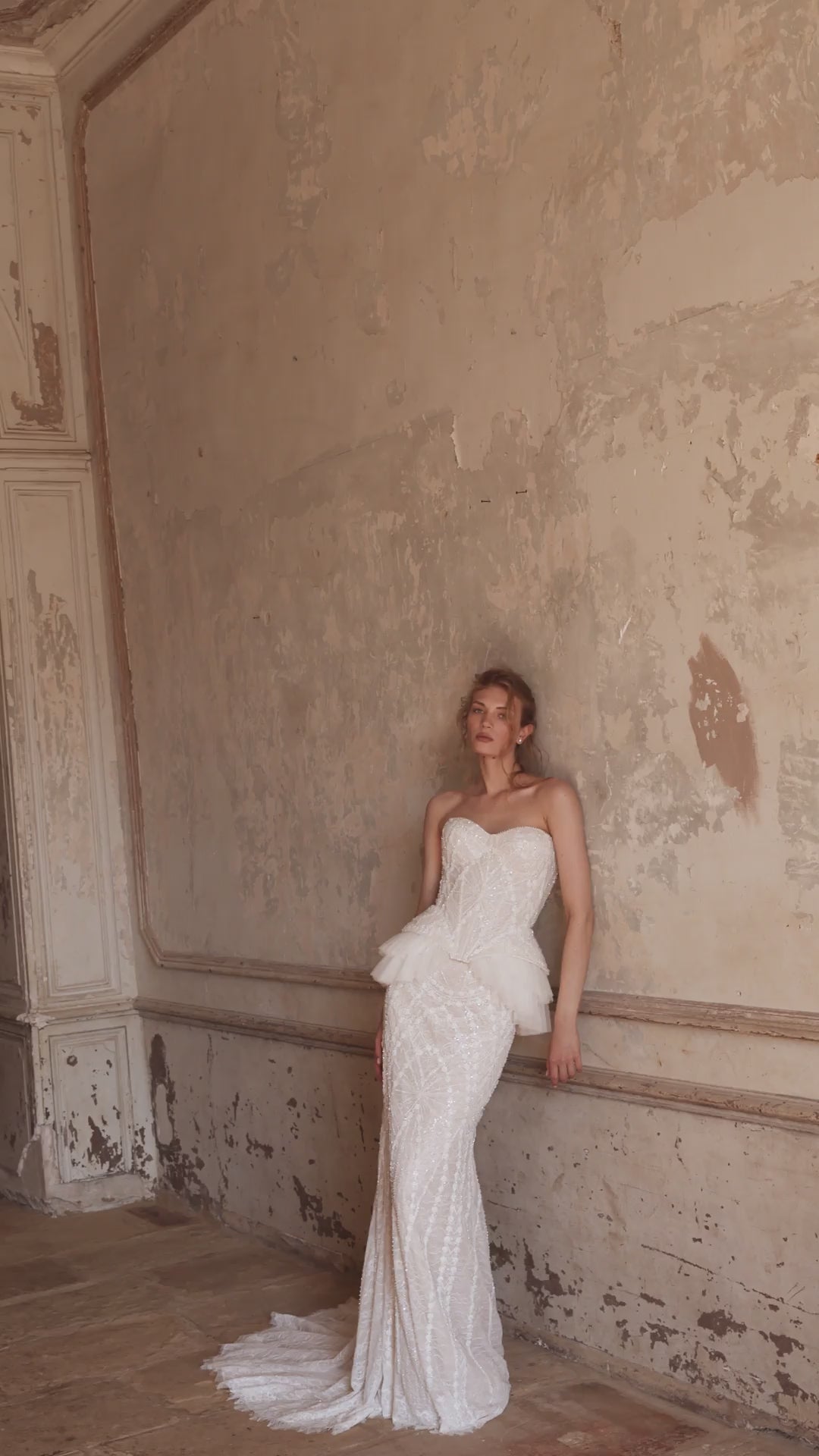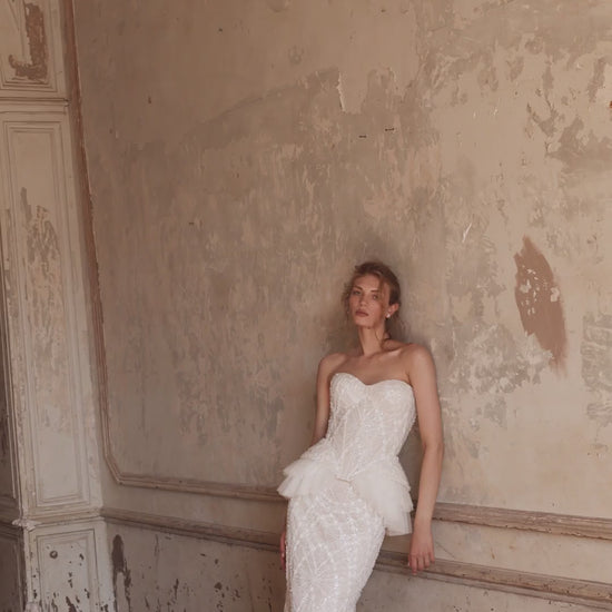 One of the most exquisite pieces of the current bridal look is a light-skinned corset. The piece's cups and sweetheart neckline highlight the décolletage line and give it an exquisitely feminine appearance. The entire corset is lavishly embellished with hand-embroidered details and lace appliqués; every aspect has been carefully researched. Hook-and-eye extenders are used to put the closure in the center back, guaranteeing a snug and comfortable fit. Detachable sleeves made of the same pleated mesh can be added to the set to give it a romantic and airy appearance. The traditional white hue is another option for this corset.