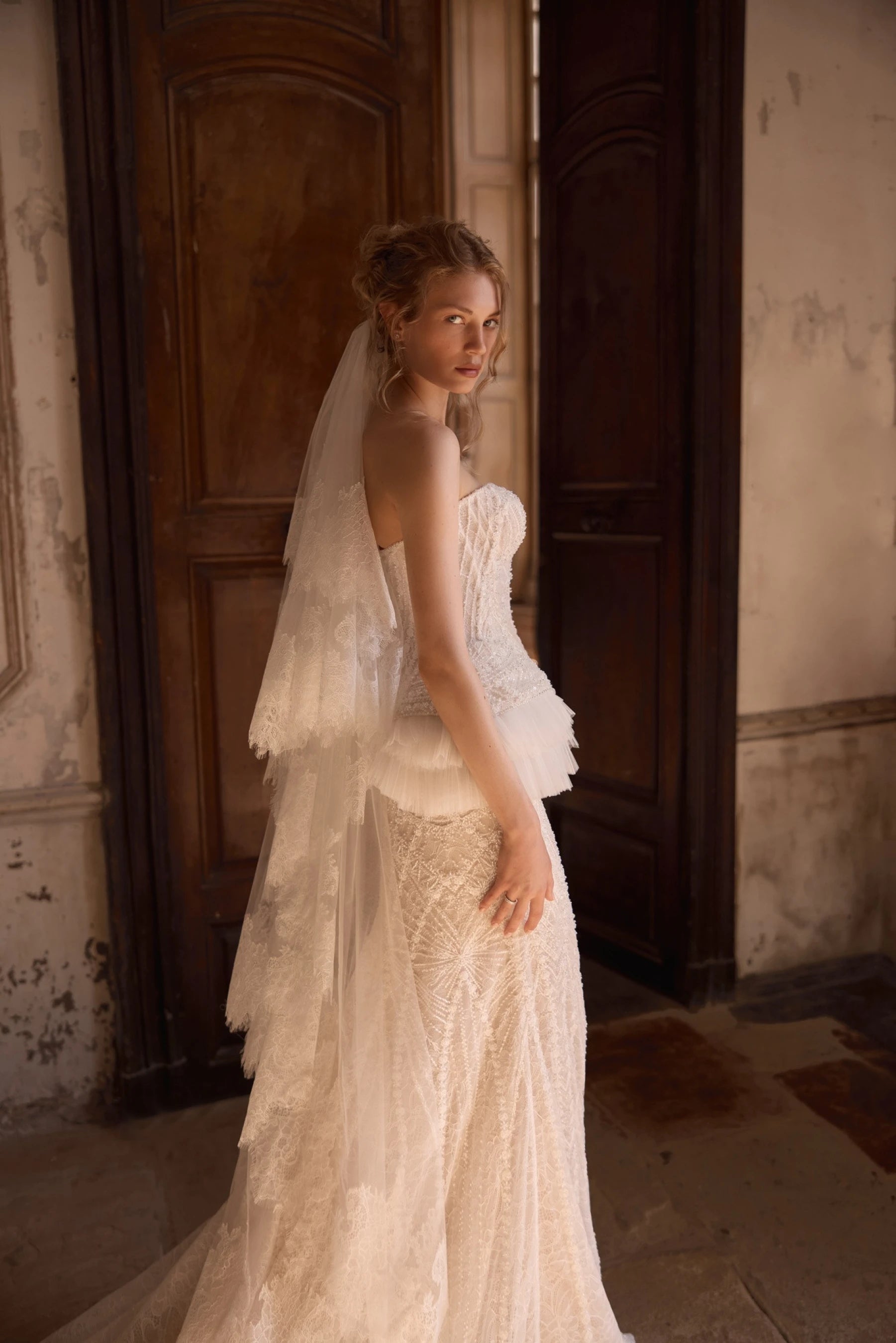A sophisticated light-skinned mermaid-shape skirt. The hip area is elegantly hugged by the fitting cut, which flows into a sophisticated train. Every curve of the body is highlighted by the magnificent lace that delicately decorates the whole surface of the skirt, giving it a shimmering texture impression. Convenience is offered while the elegant silhouette is preserved thanks to a concealed zipper fastening. Additionally, the model comes with lining.