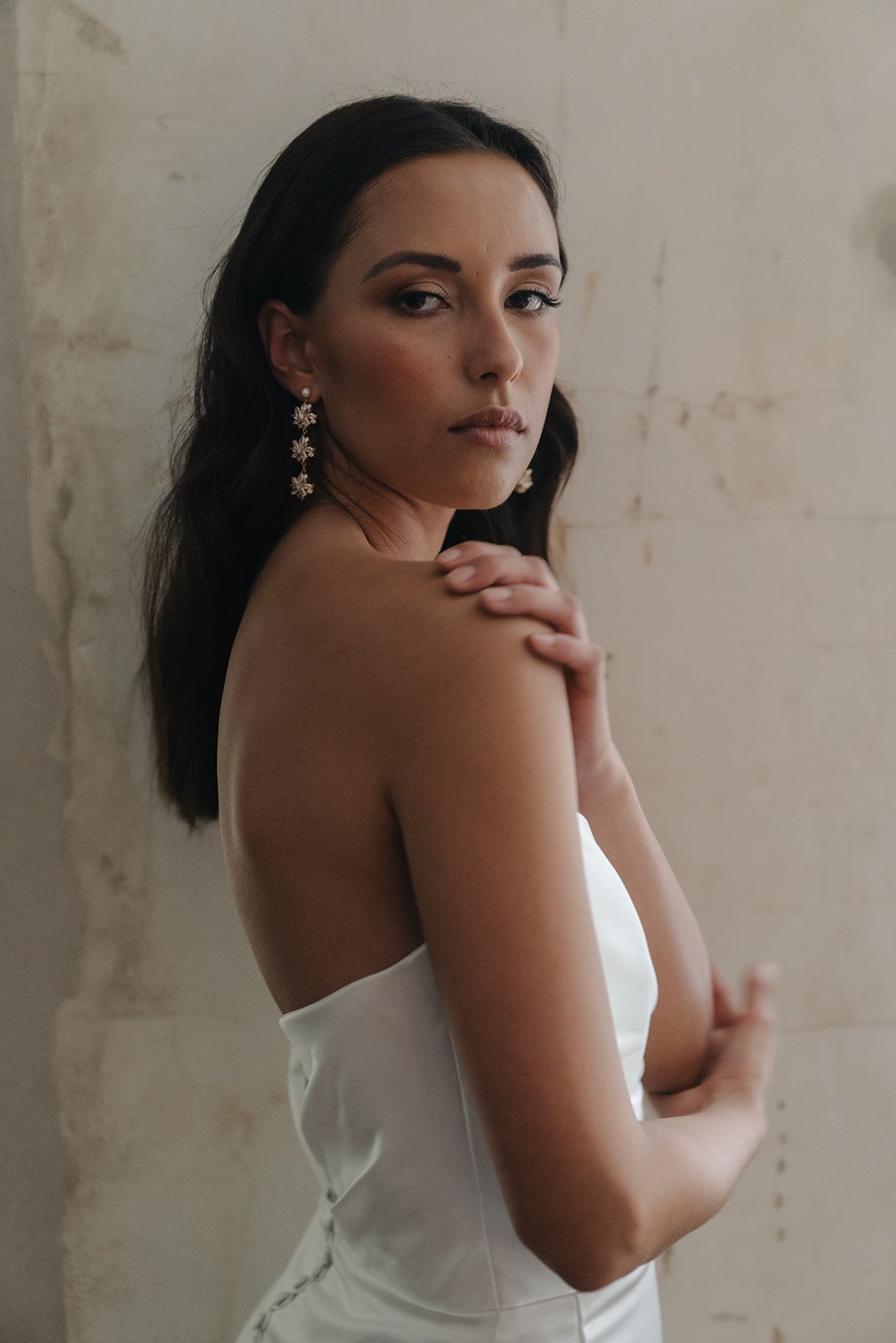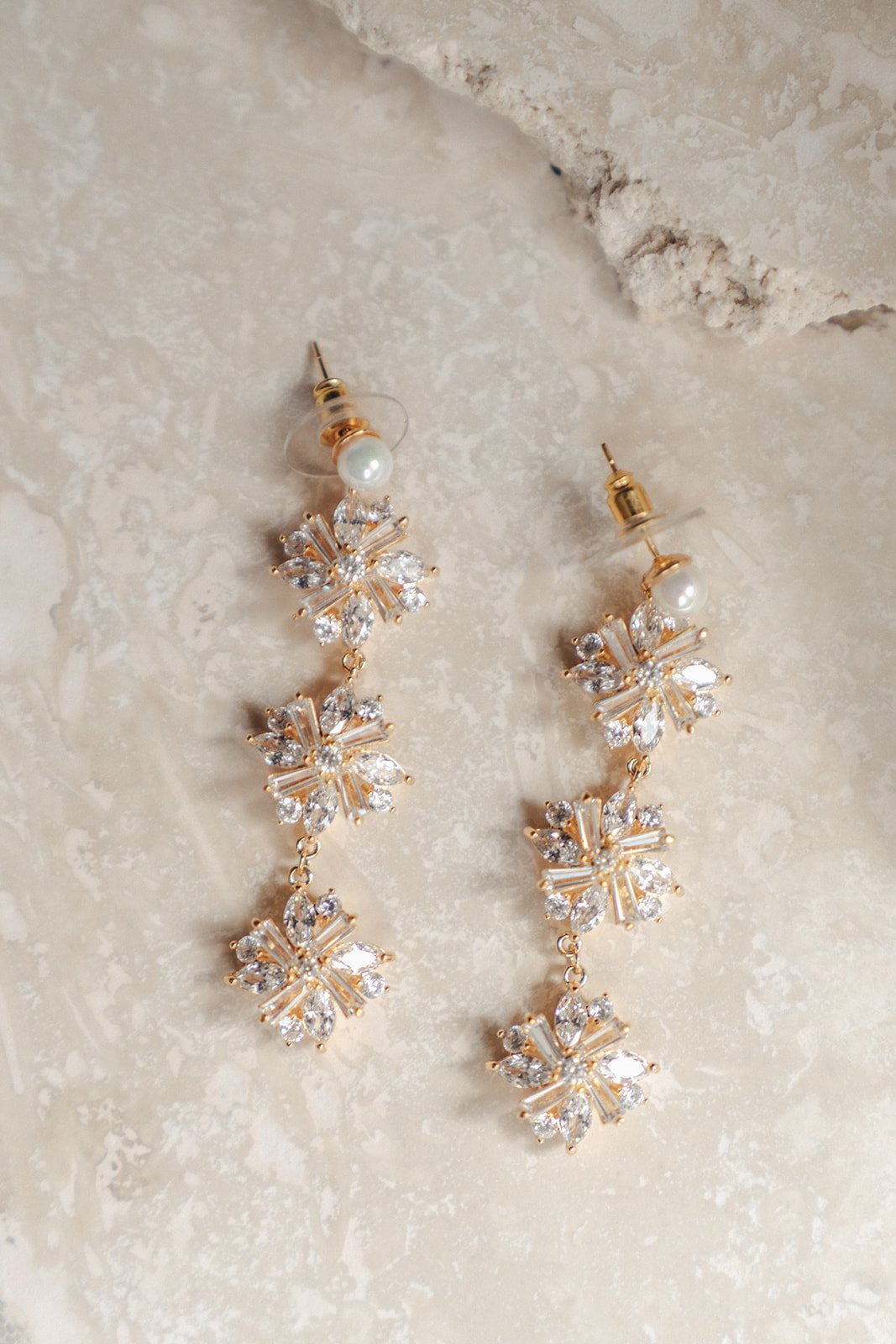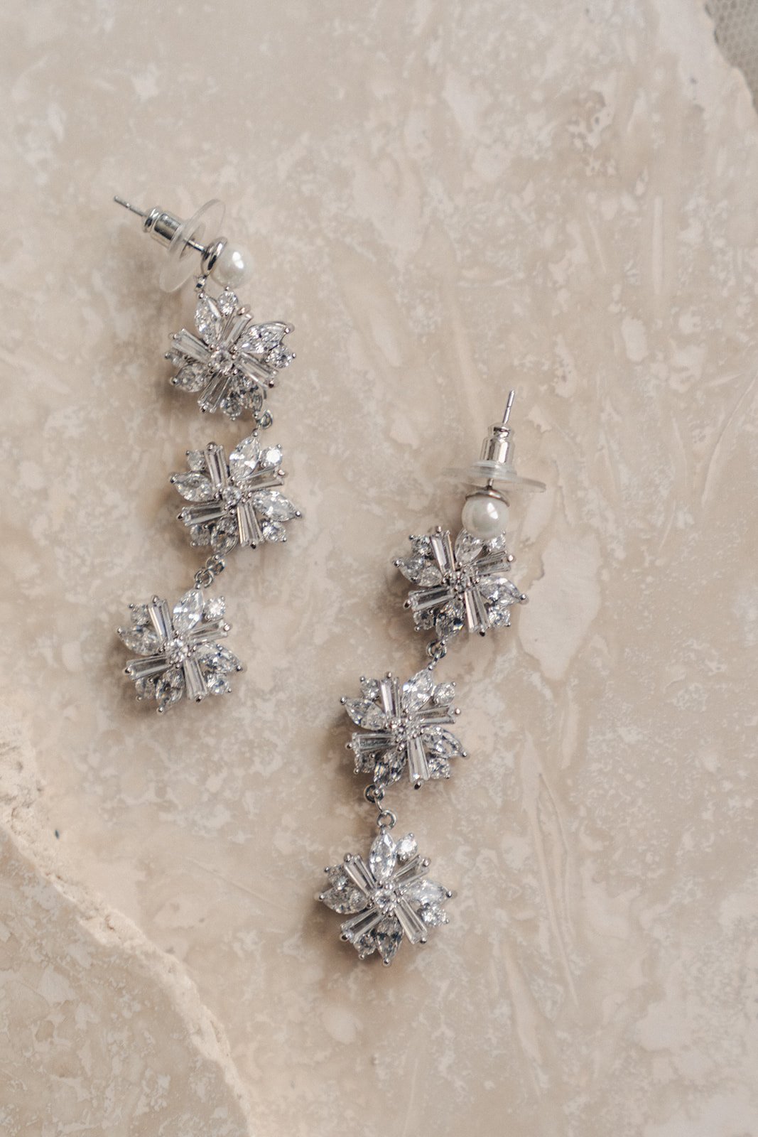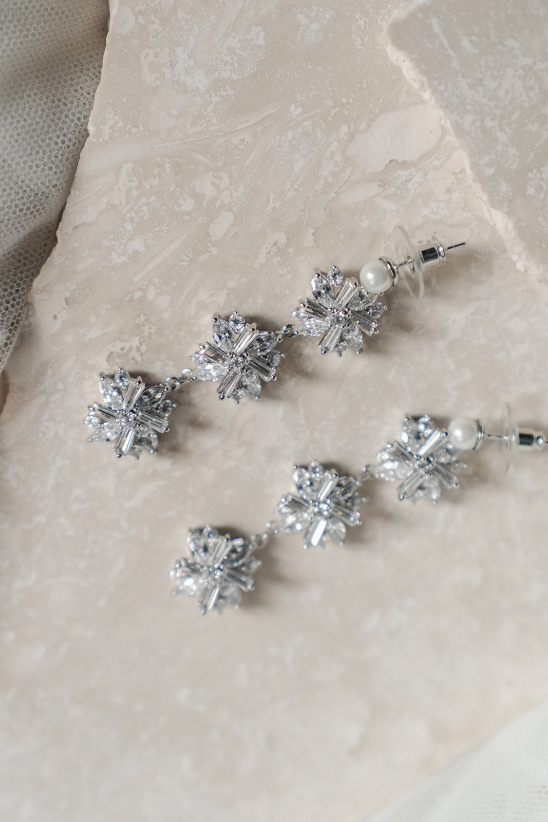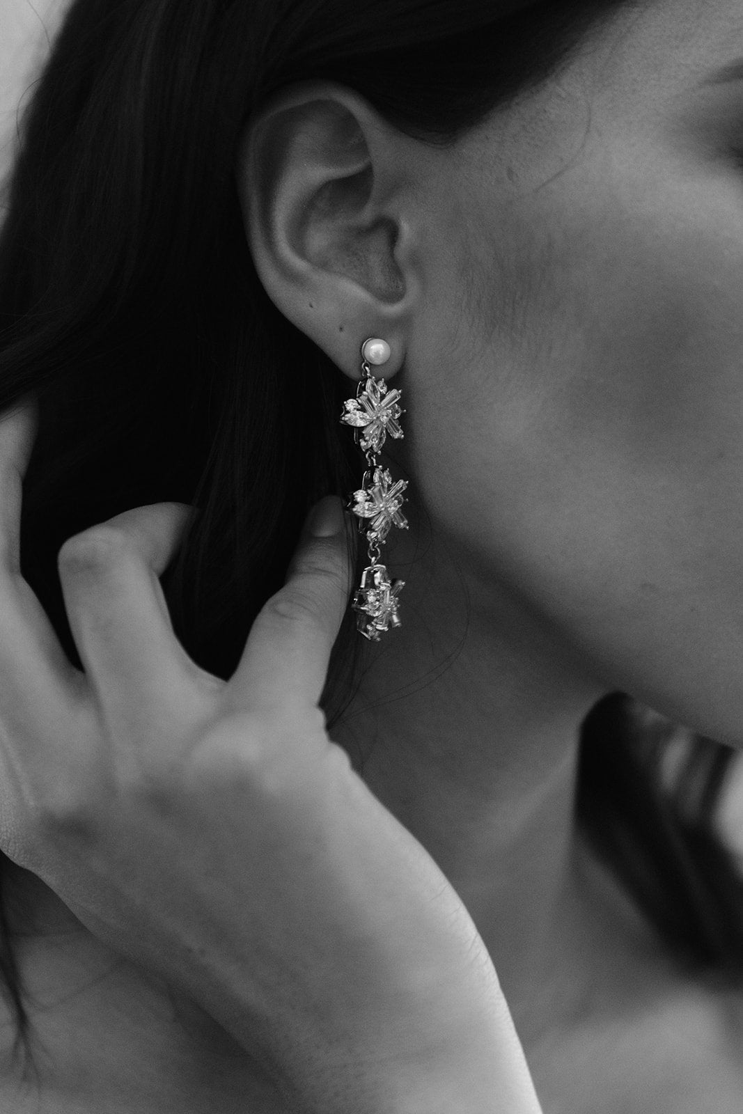 The Lilibet Earrings were made through the inspirations of our Lily earrings. Romantic and straightforward, yet they are here to capture all the attention with their stated etherial forms. The delicate rhinestone details linger throughout the shining body, adding a flawless 3-dimensional modern flair. This pair instantly elevates all looks, while still providing the romantic bridal elements.