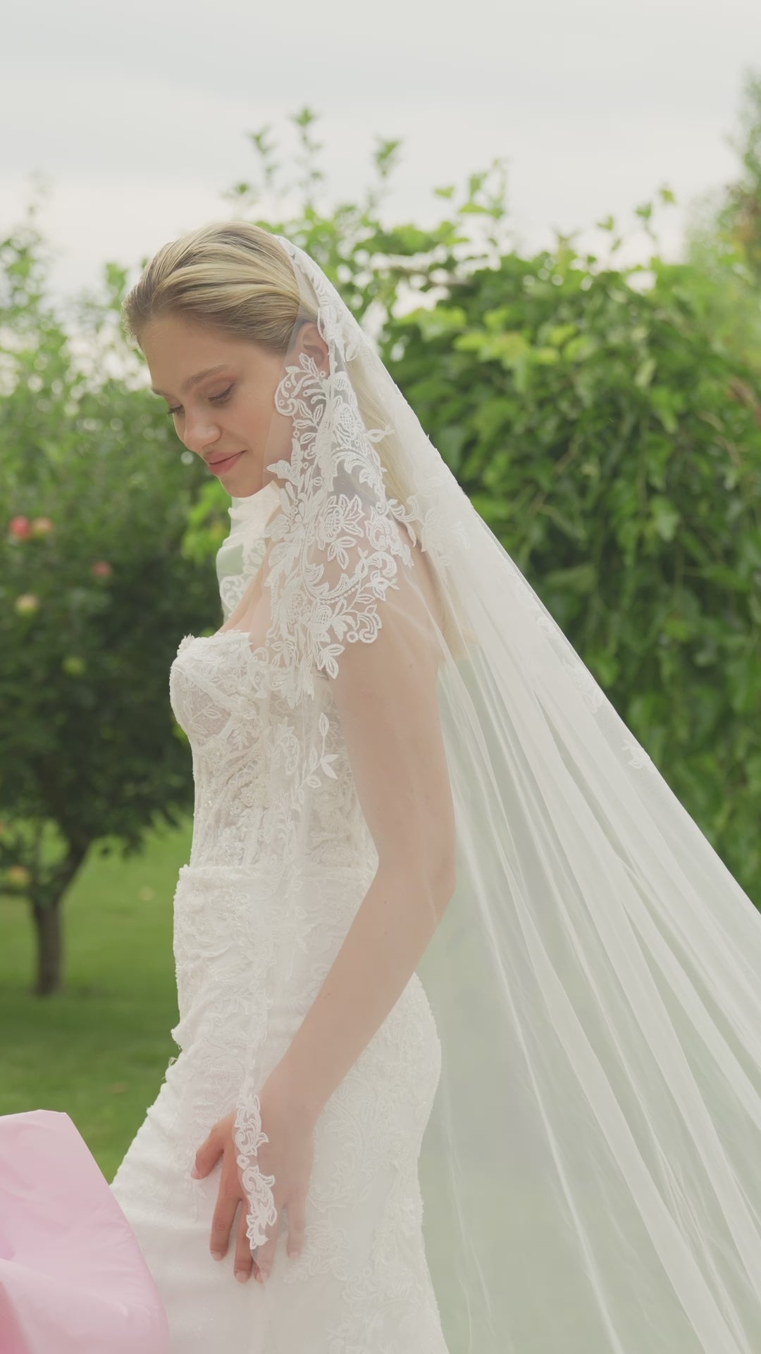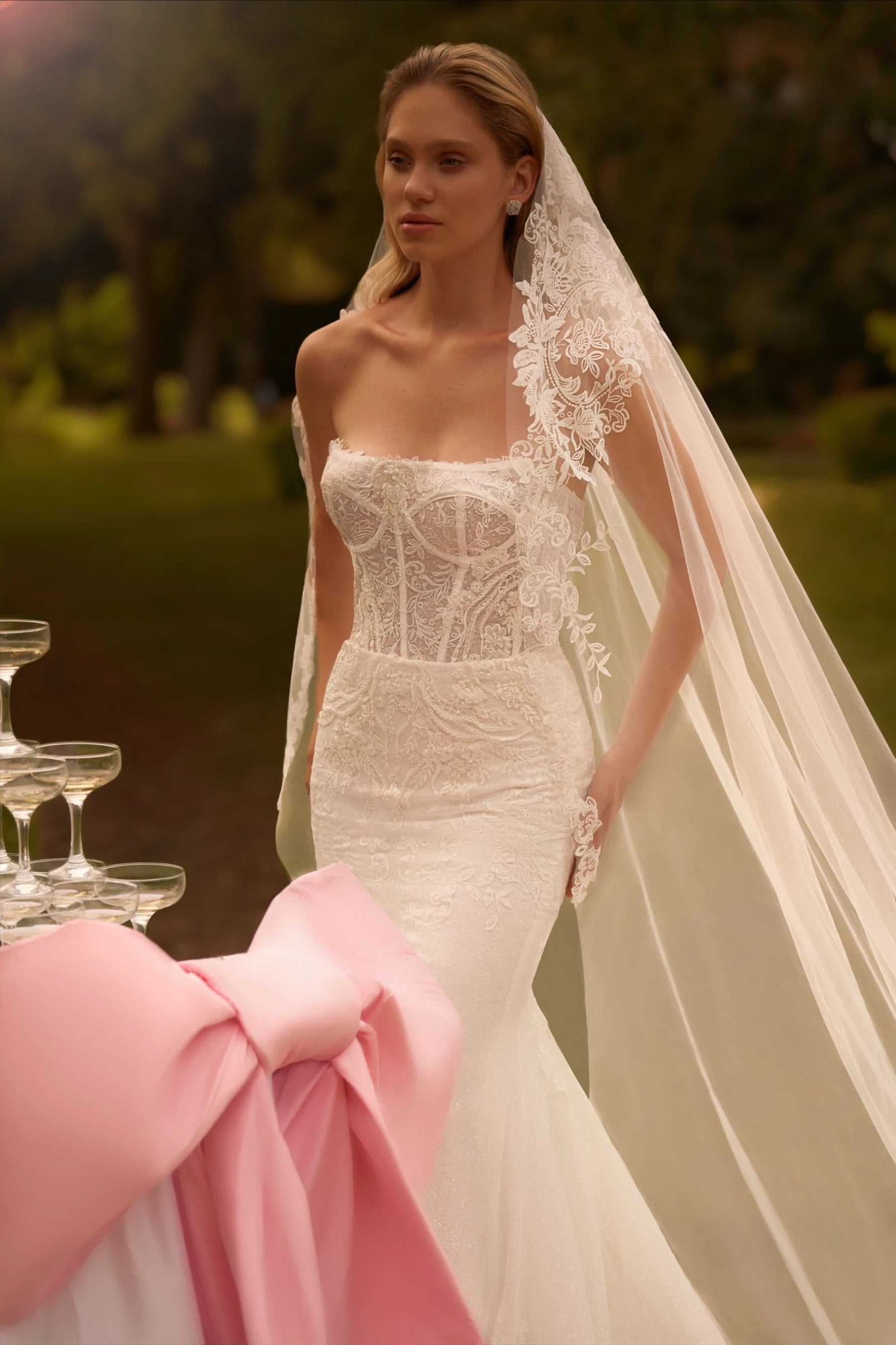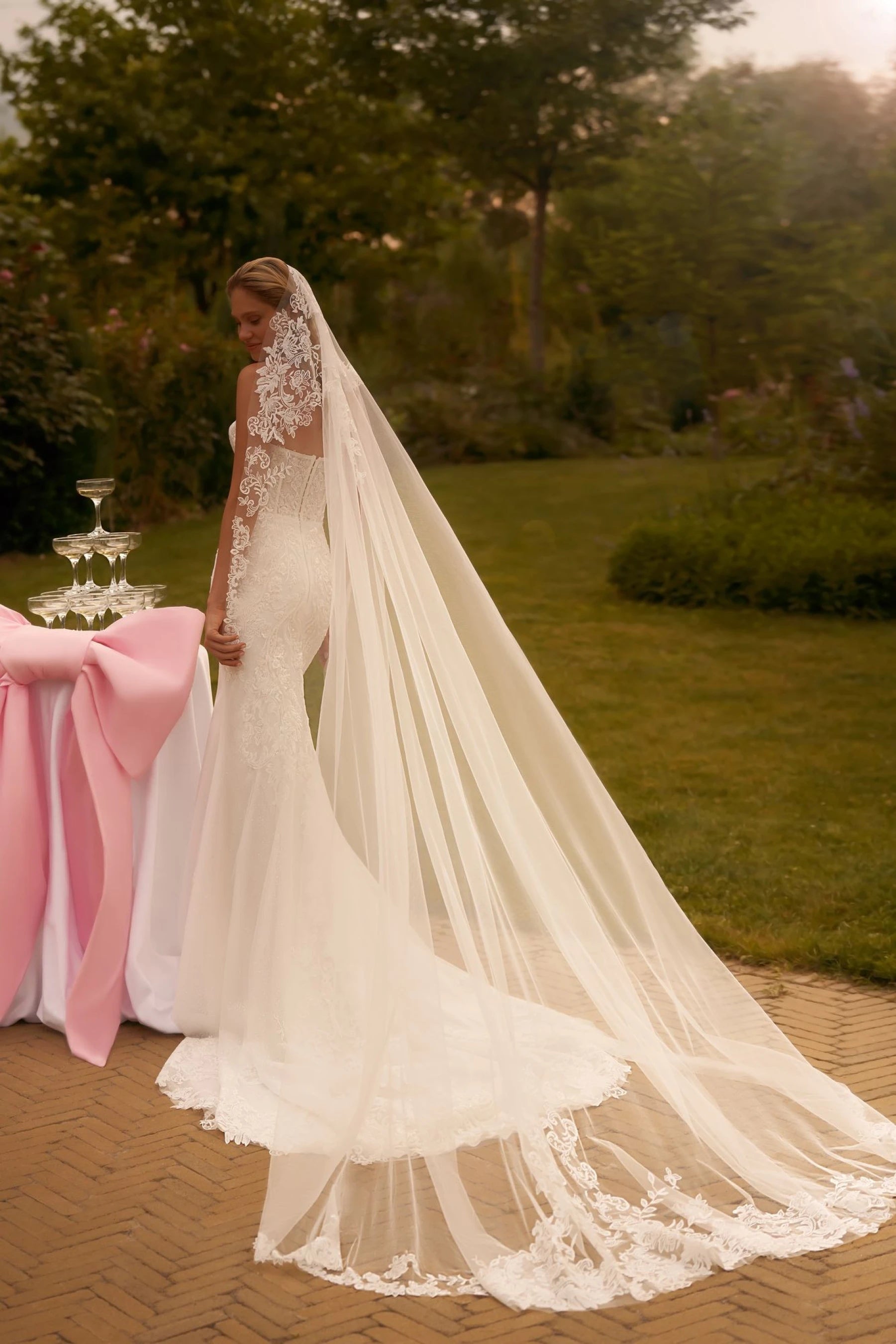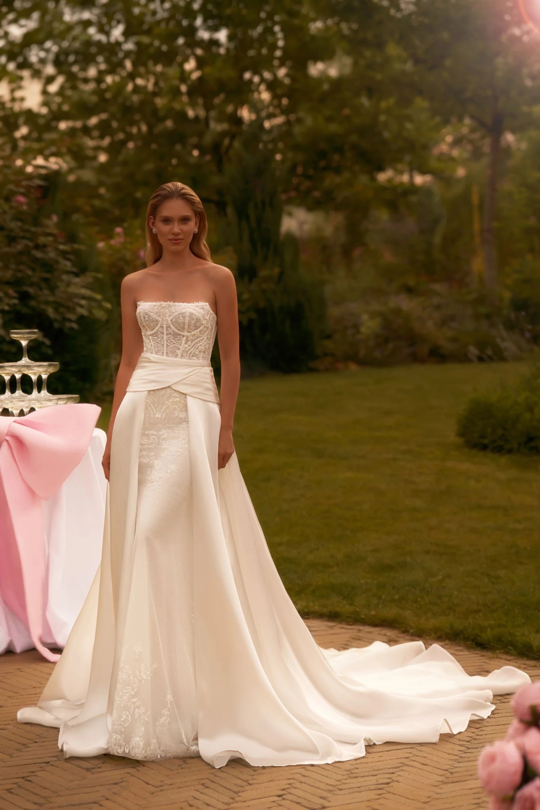 Hearts are united by the mysterious force of love. Every bride aspires to develop her own unique and memorable image because of this. The white mermaid silhouette dress is a great way to highlight each person's individuality. The dress's corset features a concave back and a V-neckline on the front. The corset's transparent top is composed of glitter and lace. The corset has ornamental satin frames. Hooks and eyelets are used to secure the corset in the middle of the back. The dress's skirt, which is also made of lace and glitter, has an exquisite train and fits snugly around the hips. A concealed zipper secures the skirt. A detachable, opulent skirt and detachable, puffy sleeves can be used as part of the outfit.