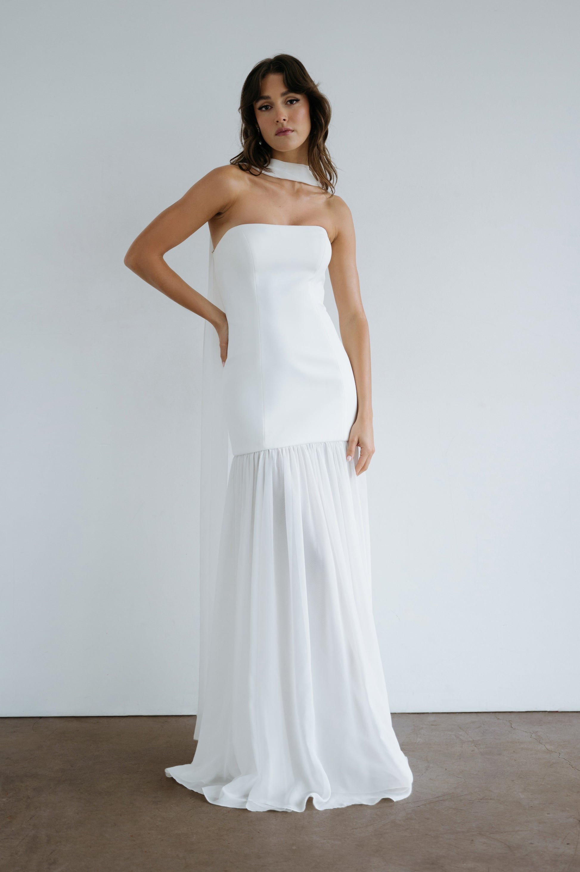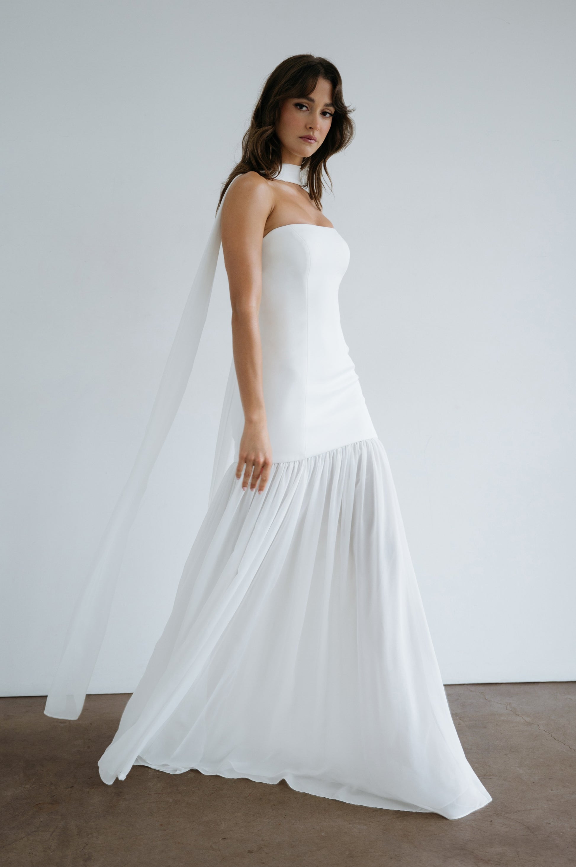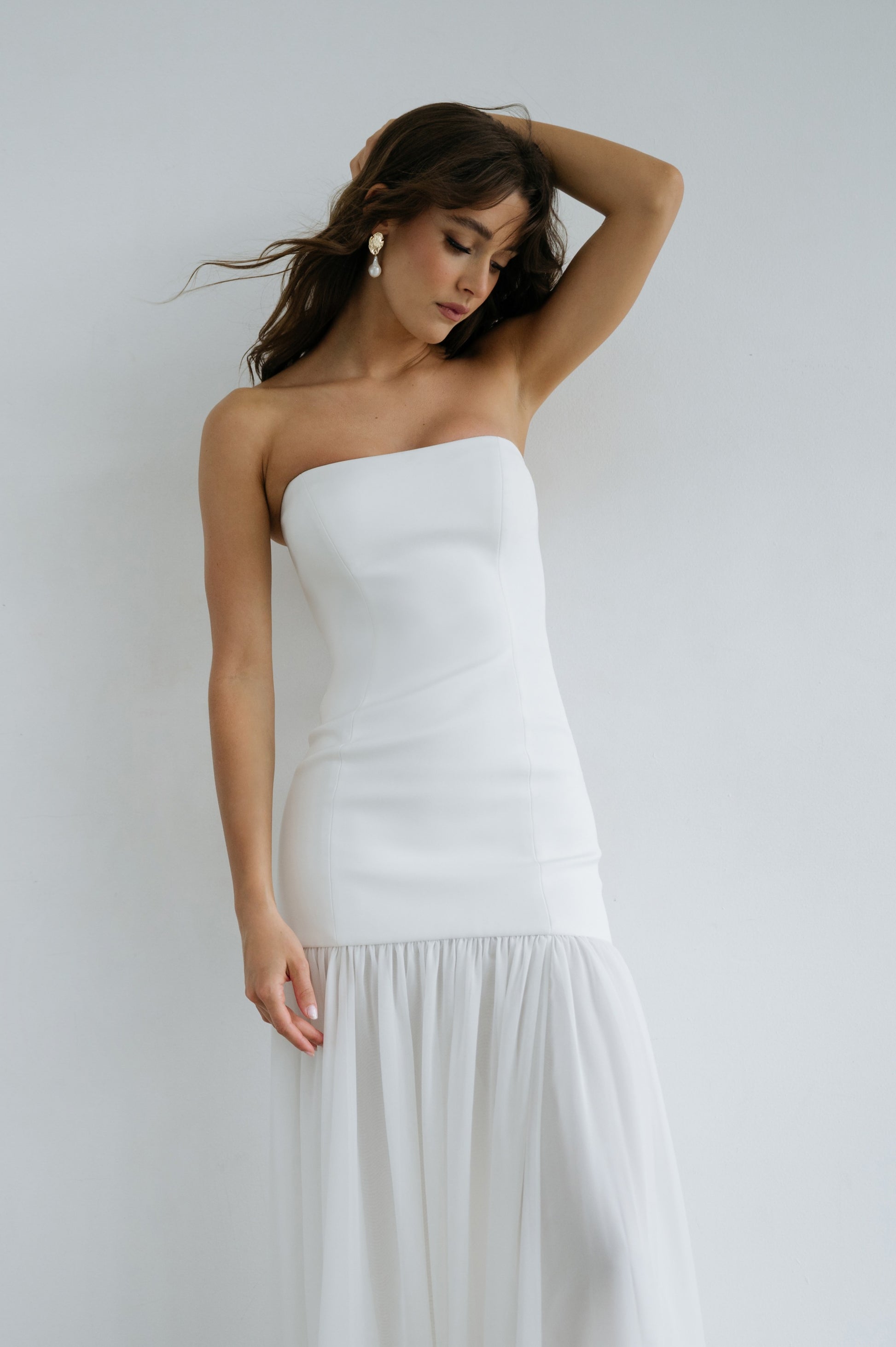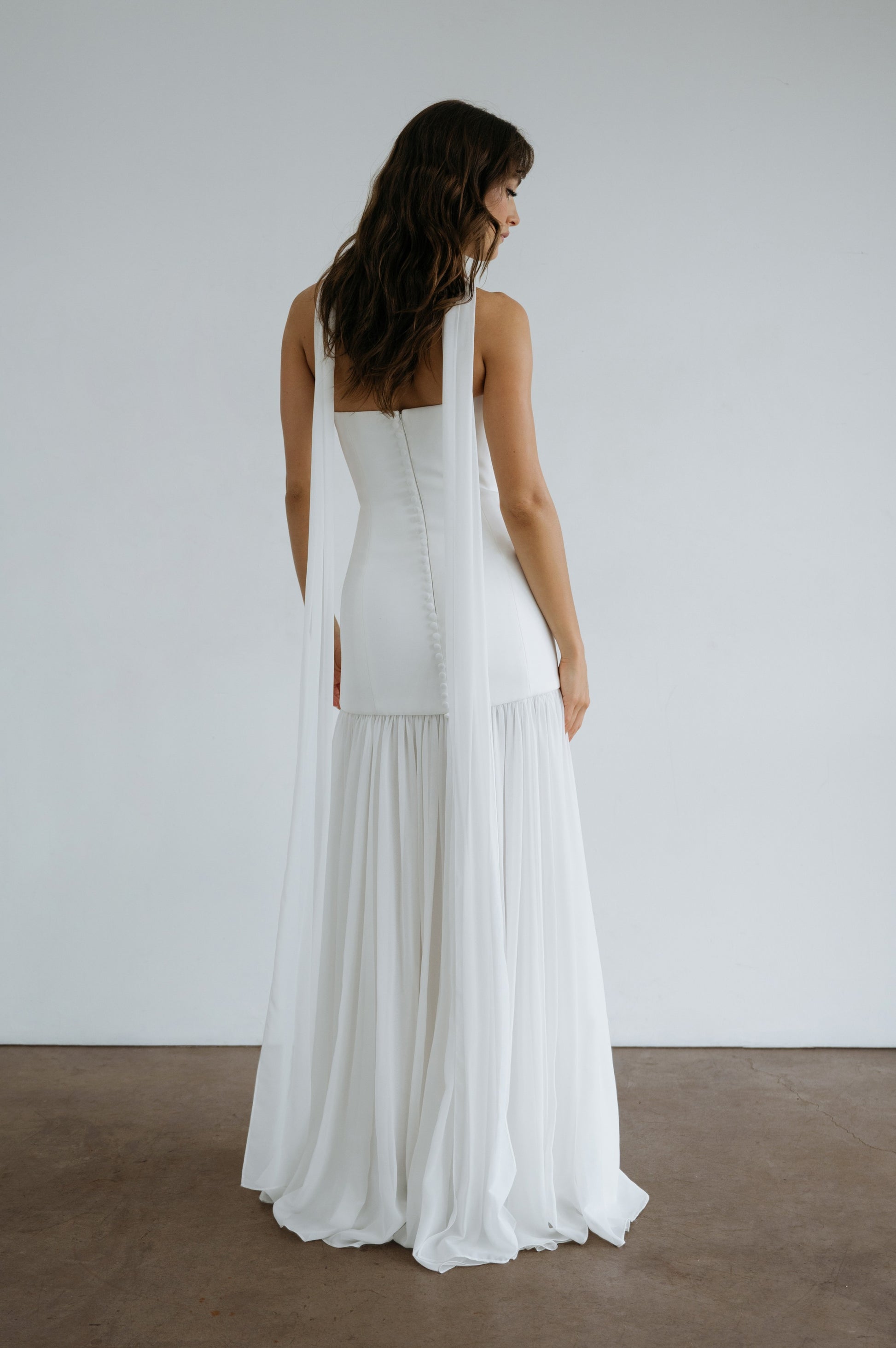 The Matilda dress is a harmonious blend of contrasts. Its sharply tailored mini silhouette is softened by a flowing, romantic chiffon overlay. It embodies elegance without effort, formality with ease, and a timeless charm infused with modern appeal.
