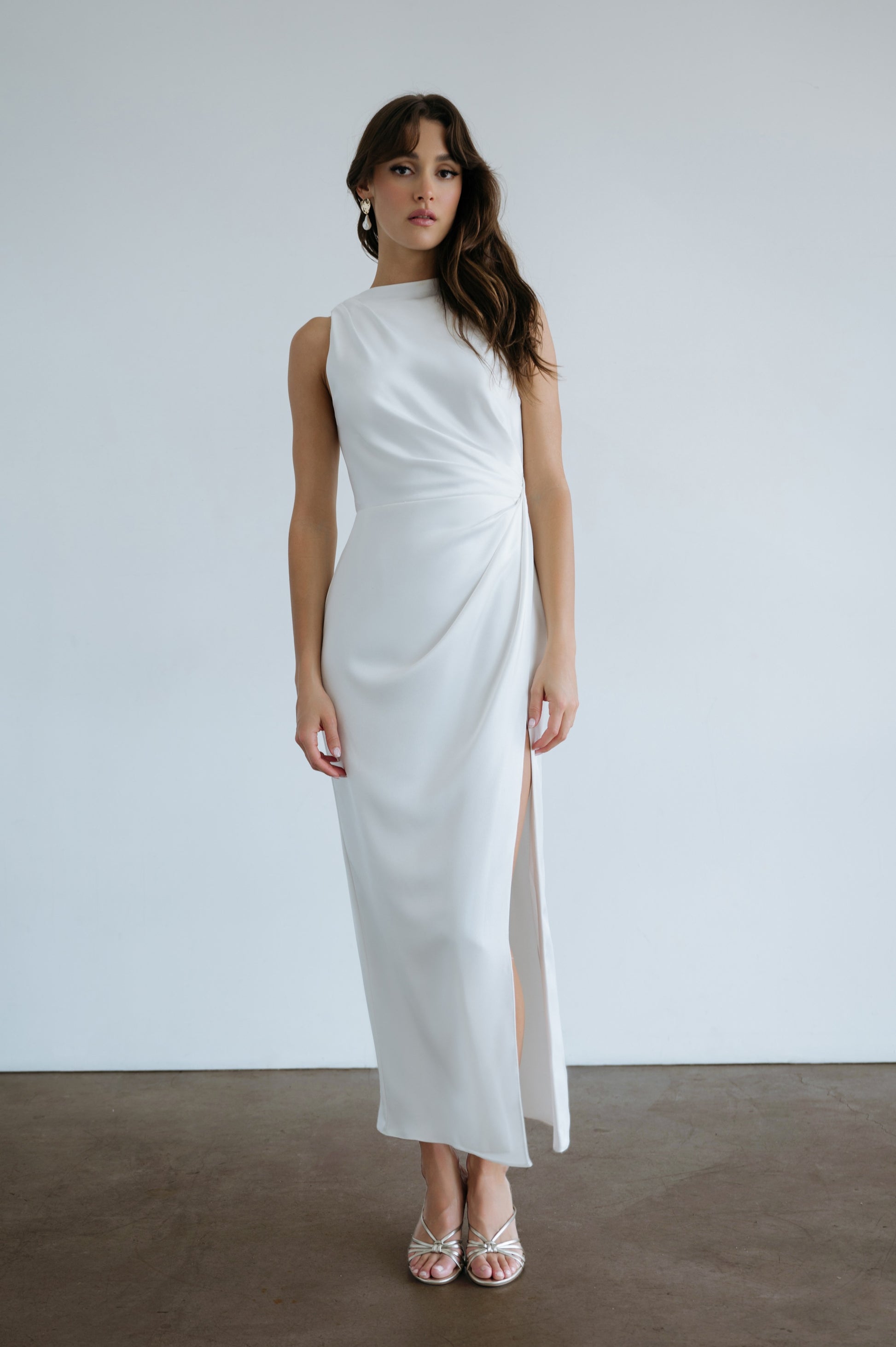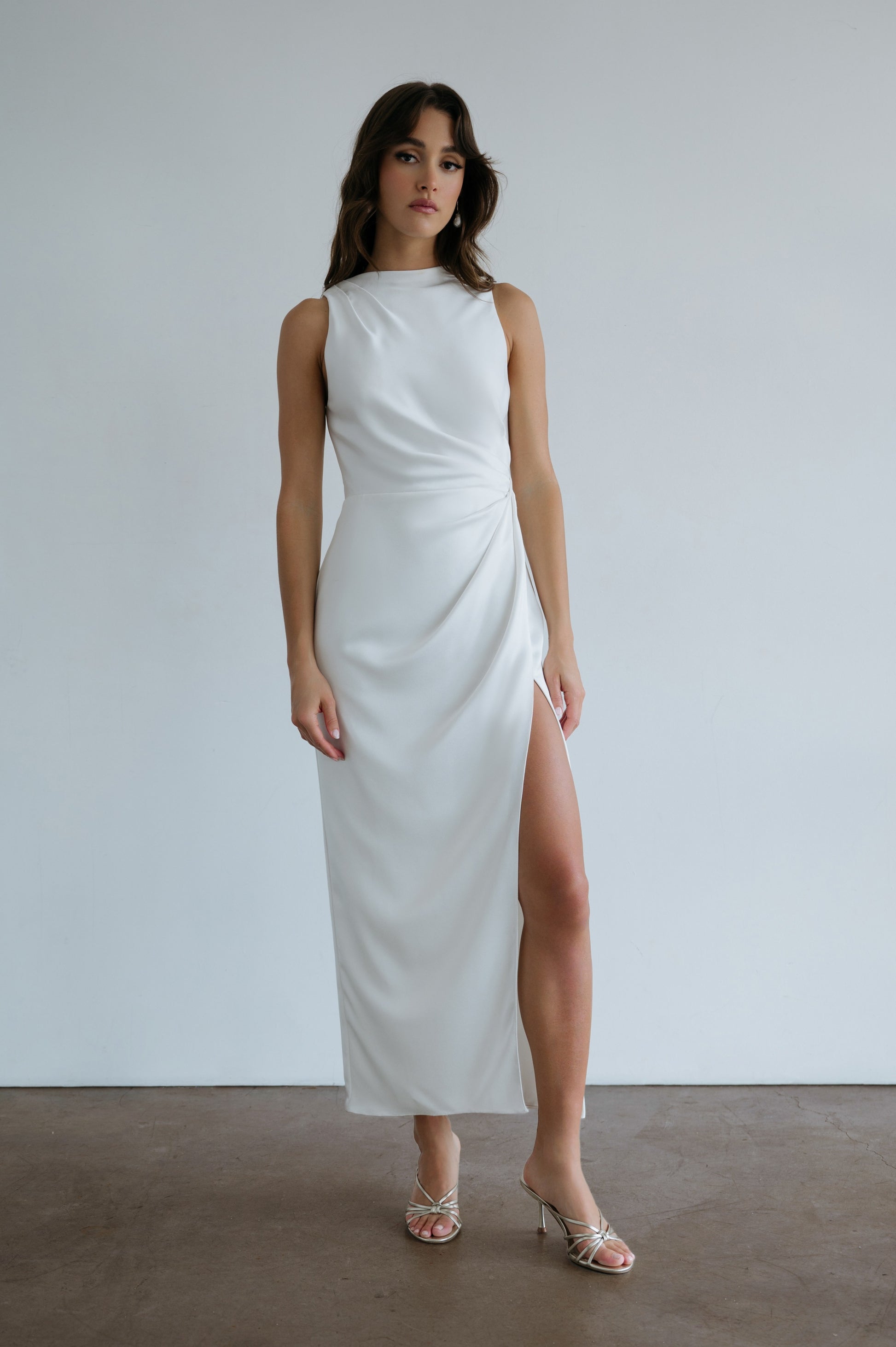 The Patricia dress exudes timeless elegance with a hint of understated allure. A chic, modest neckline is perfectly balanced by a subtle, seductive slit, while carefully placed pleats sculpt the silhouette and gracefully flatter the midsection.