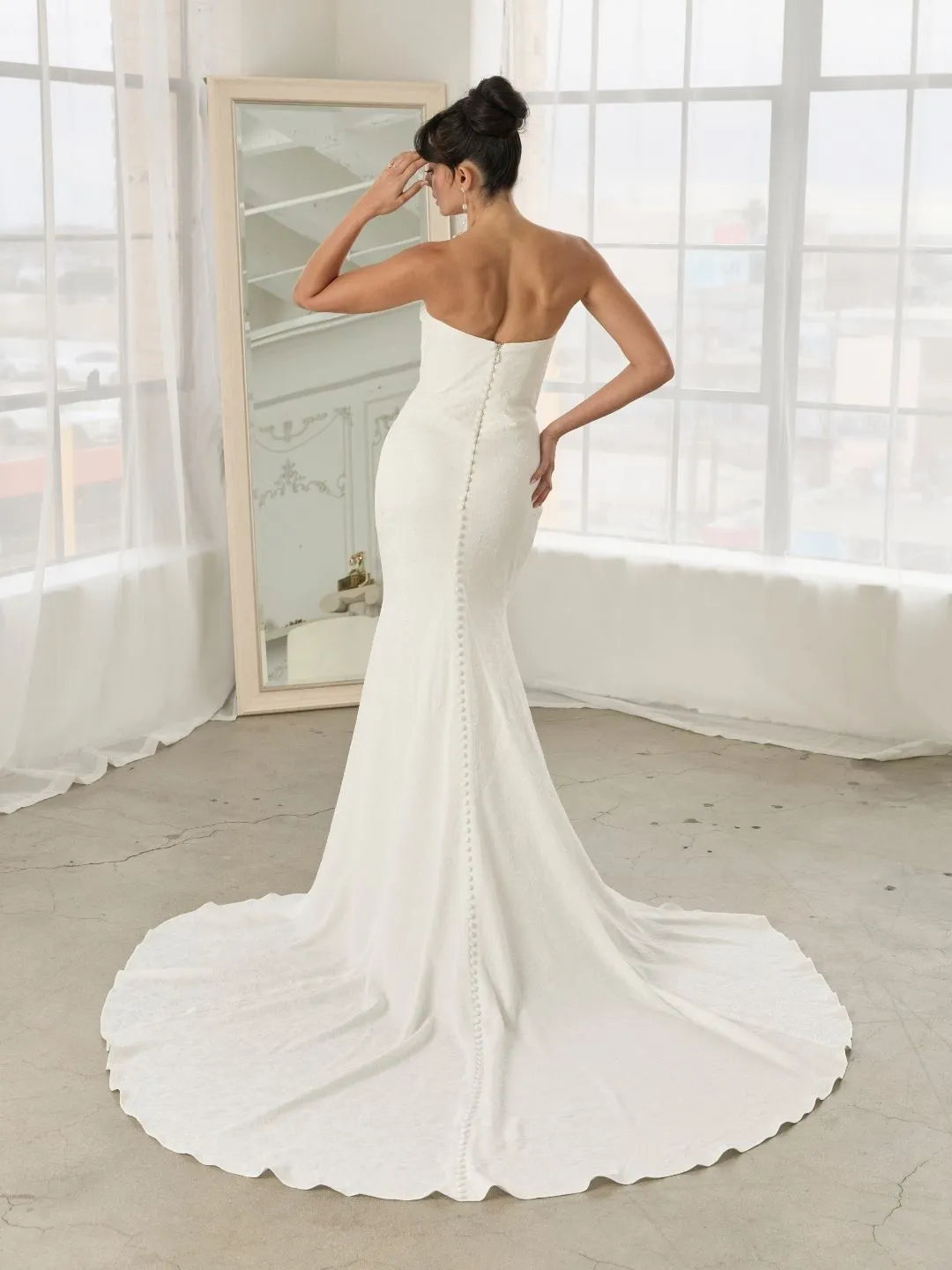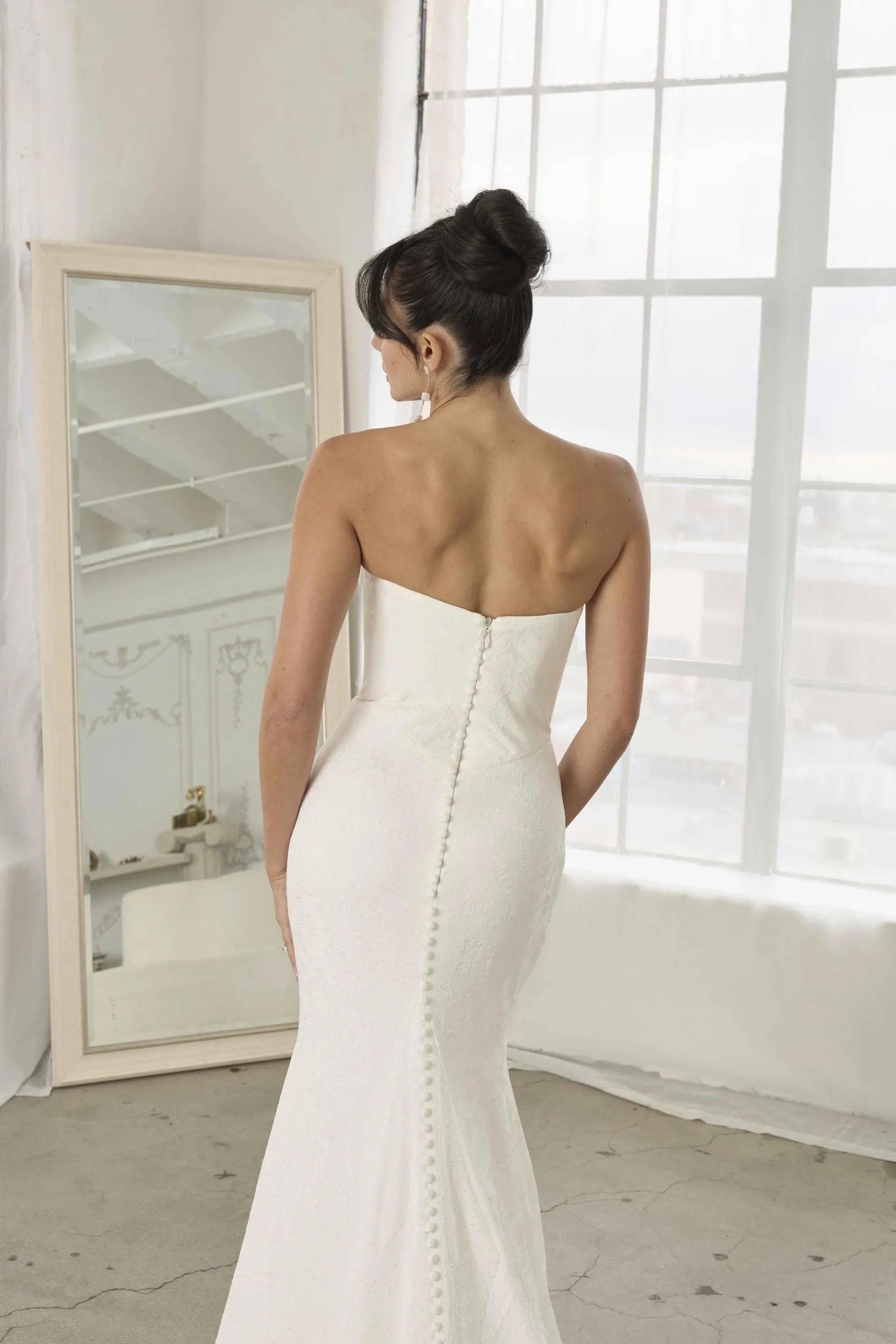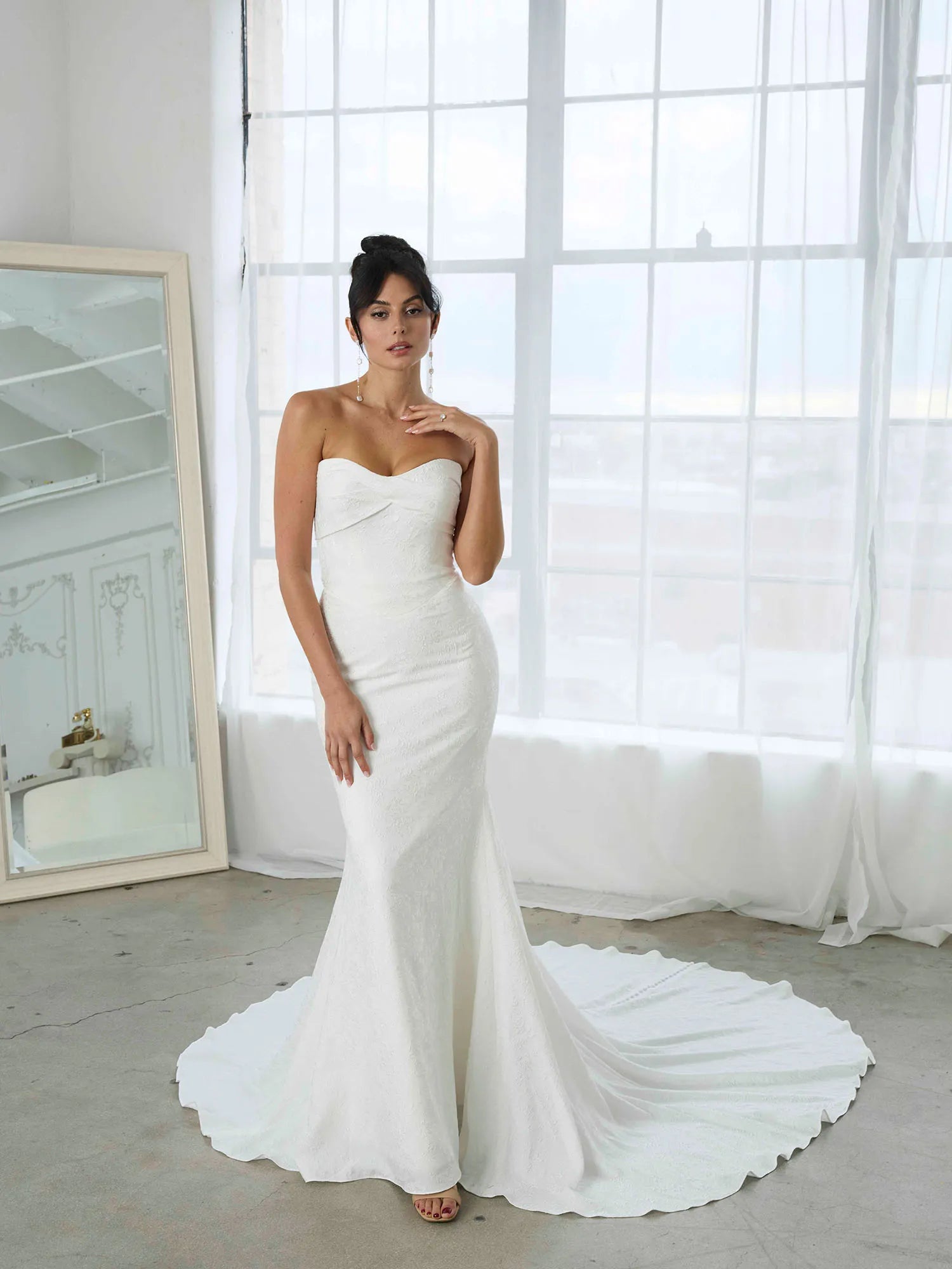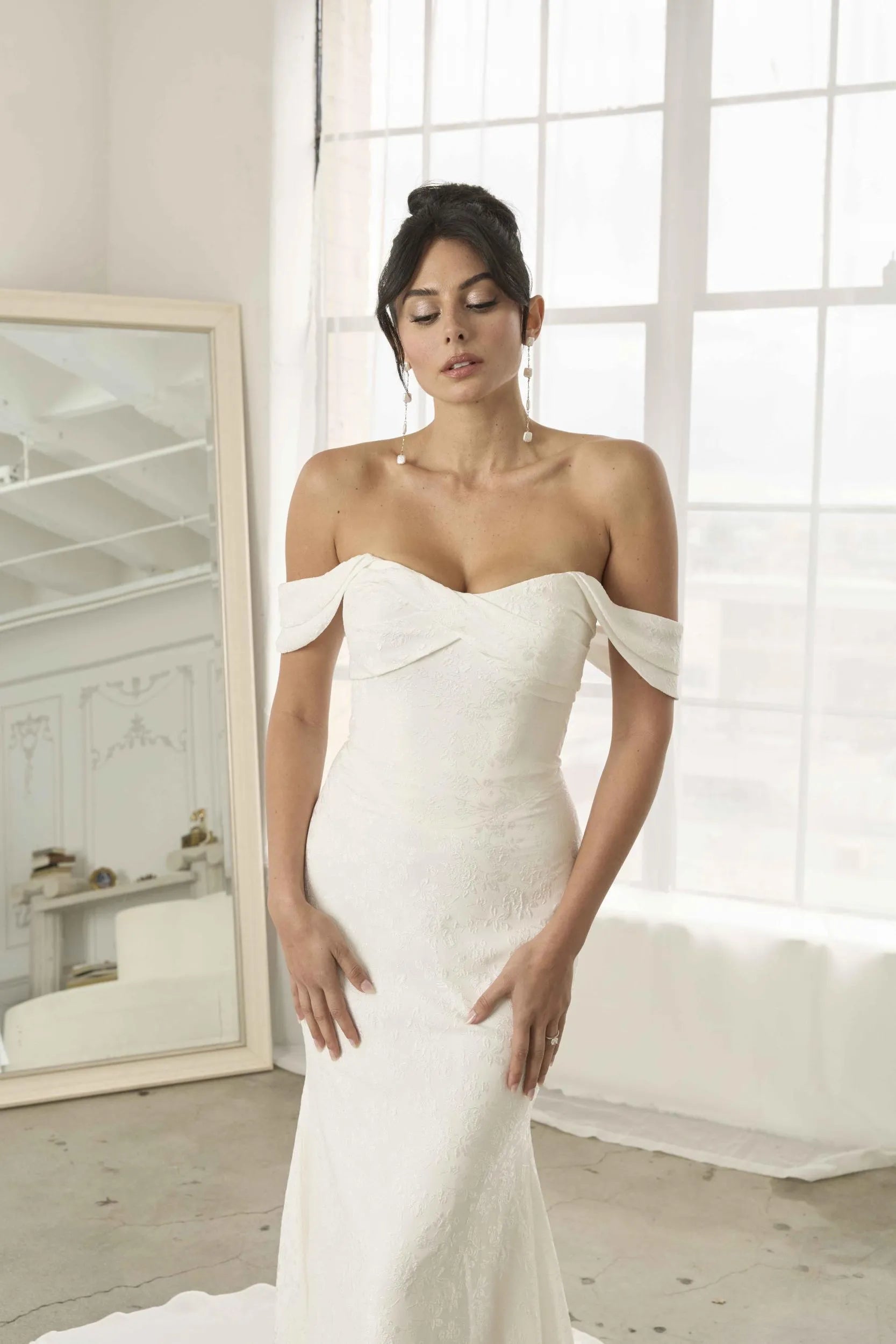 If the bride wants a classic but modern style, Rhett is the appropriate gown. Rhett is made of sumptuous embossed stretch crepe and has a sleek, sophisticated look with fun, flattering, and feminine features. The sweetheart neckline with an off-center twist makes for an interesting and one-of-a-kind look. The pleated straps that go off the shoulder add texture and volume, drawing attention to the rounded Basque waist. The fit-and-flare skirt makes the bride's form look better by flowing elegantly to make her look graceful and confident.