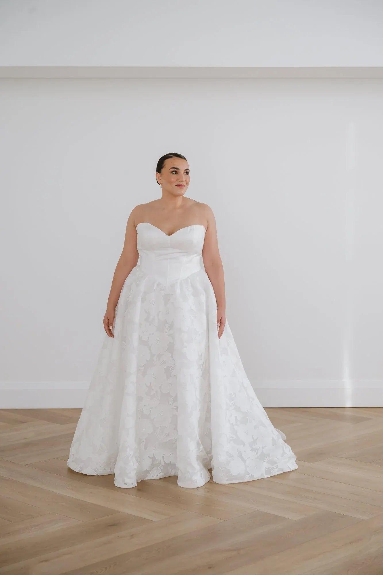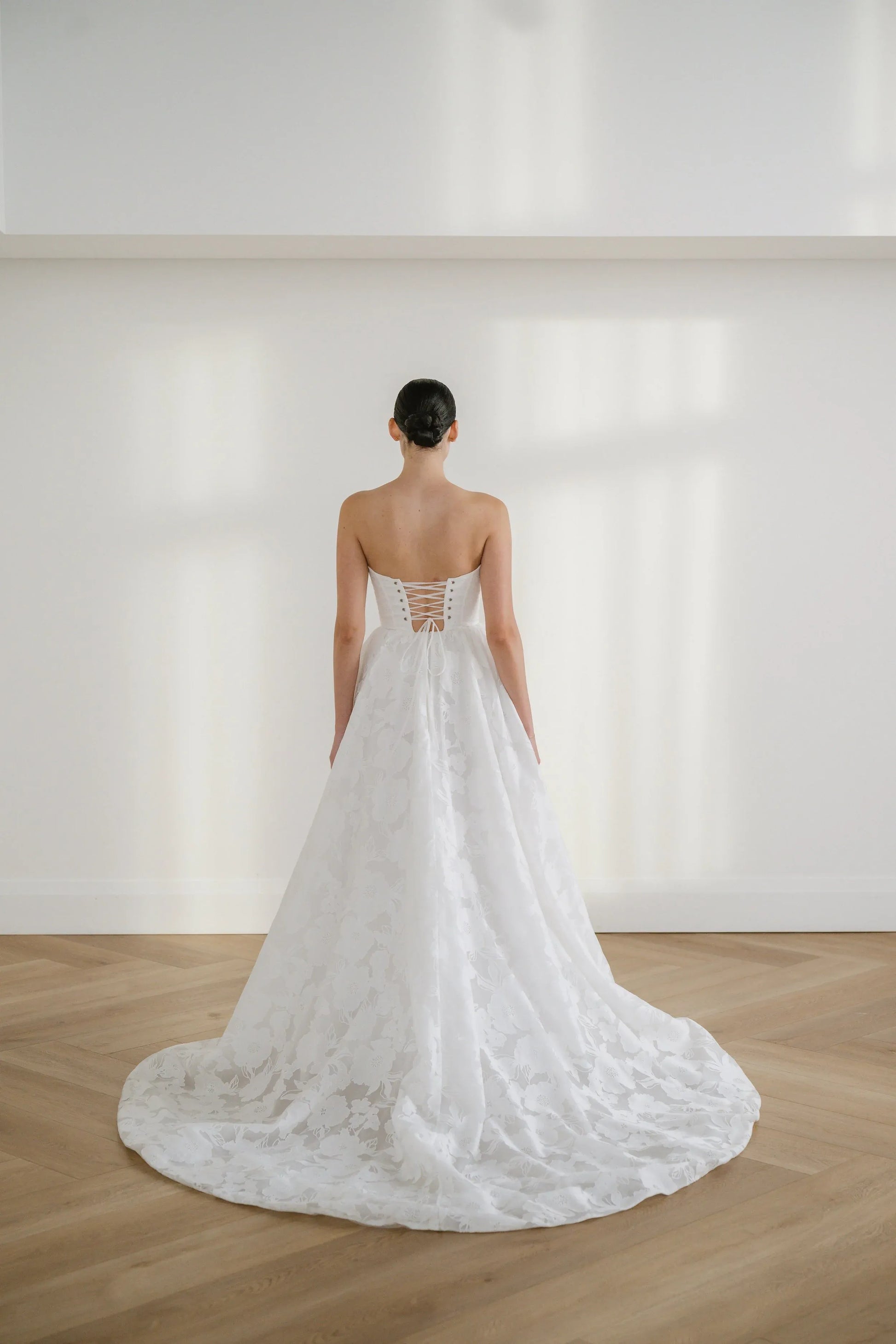 Sheet lace, strapless, sweetheart neckline, Basque waists, decorative seam design on the bodice, full A-line skirt, corset back with chapel train.