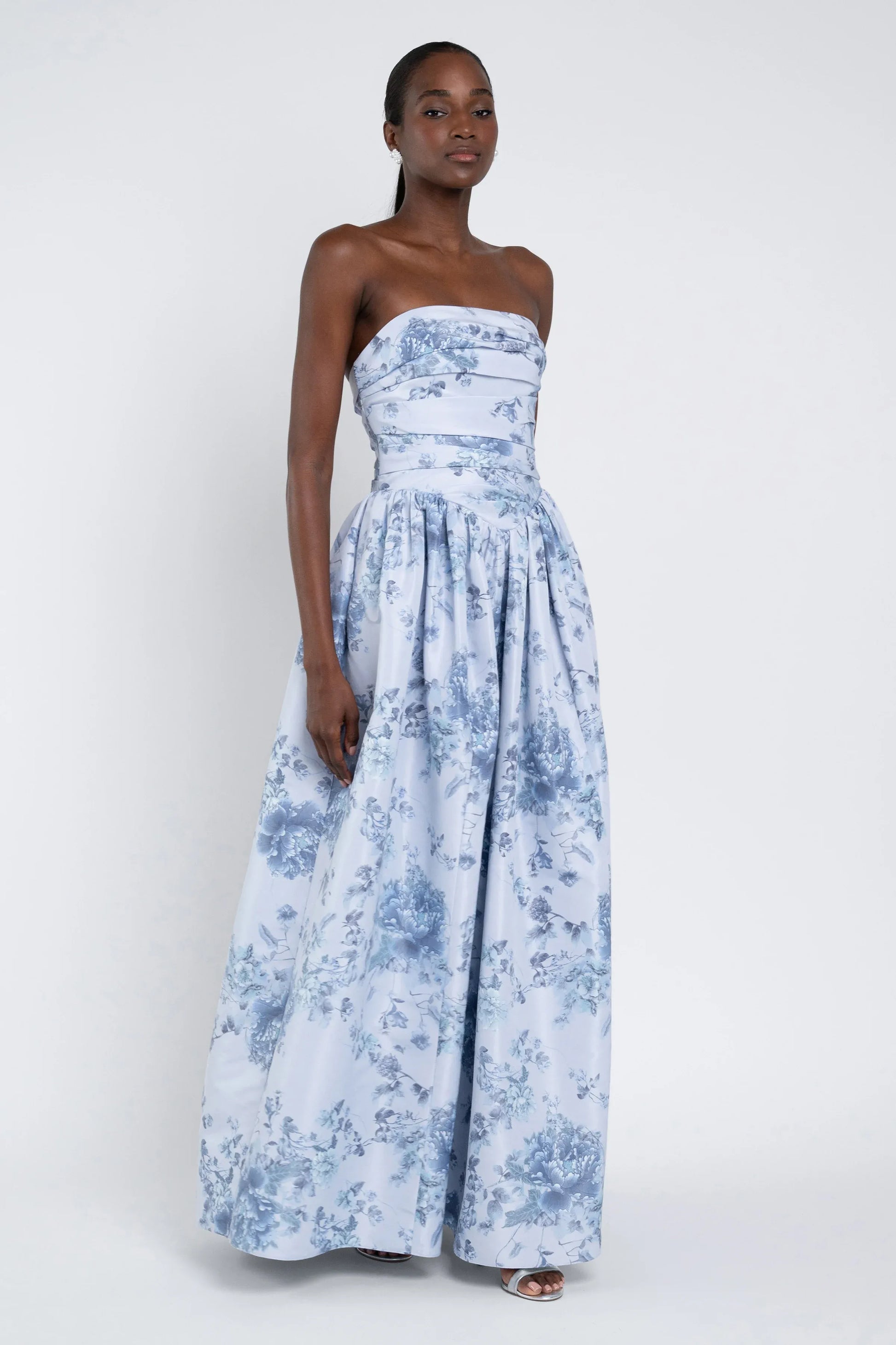 The Scarlet dress, cut in our new light taffeta fabric, features a pleated strapless bodice, Basque waist, and full gathered skirt.
