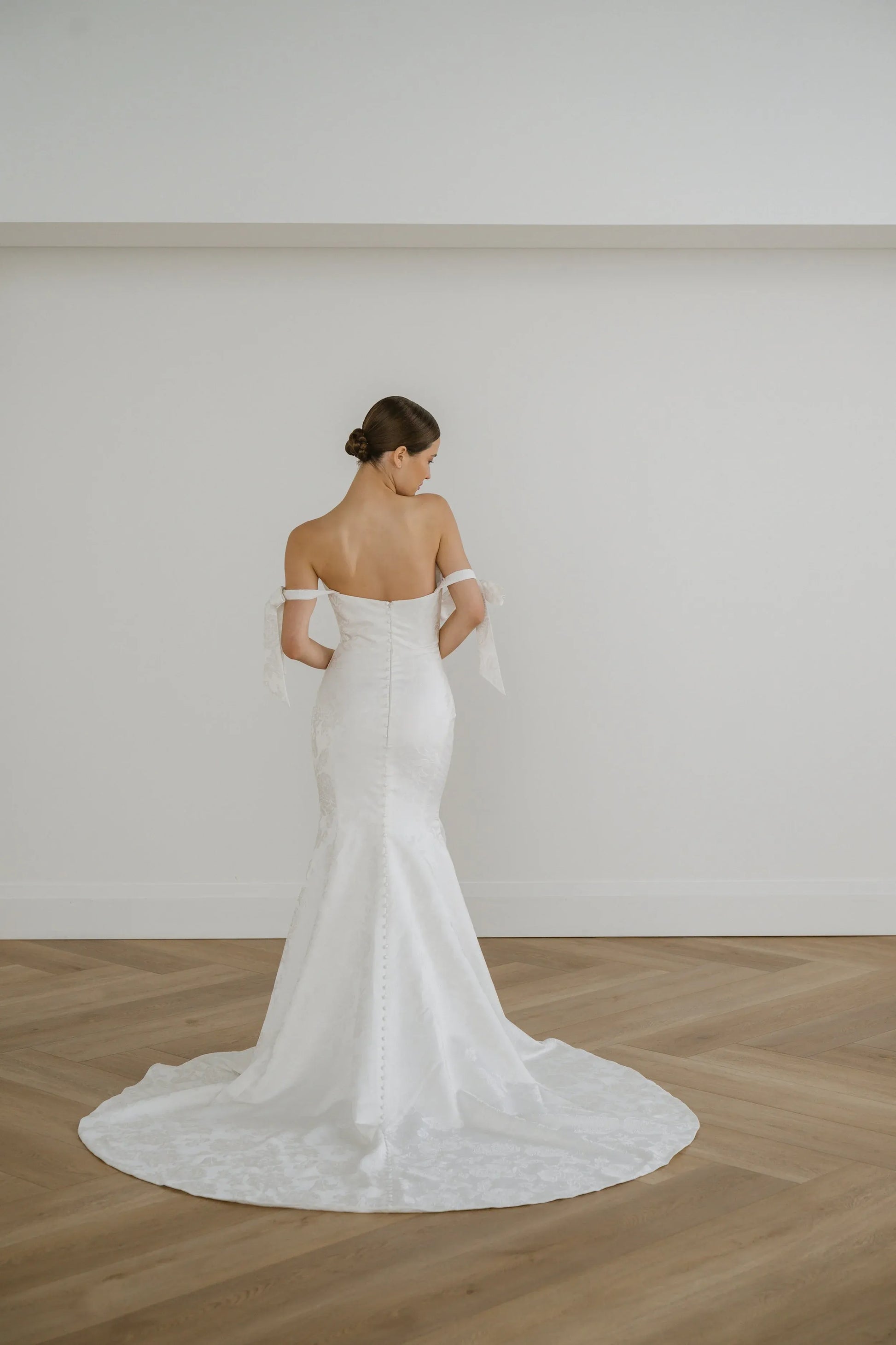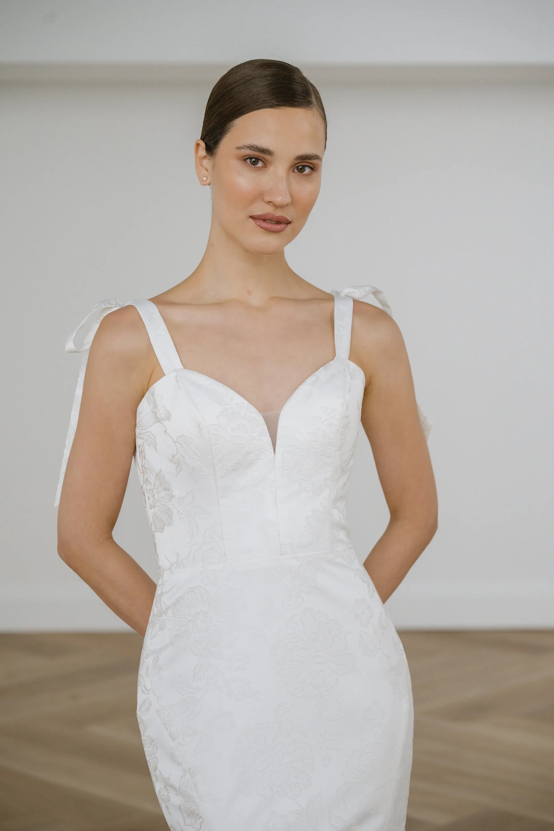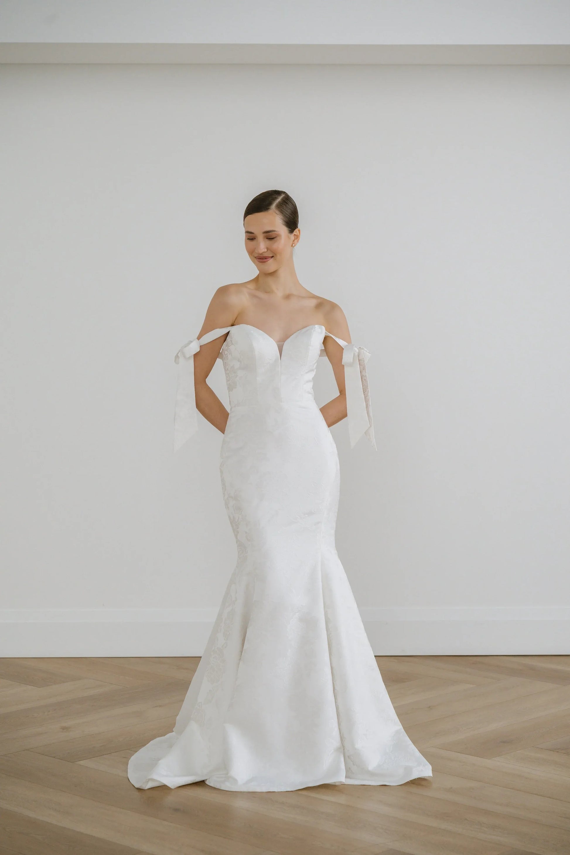 Butter mikado gown with sweetheart neckline, fit-to-flare skirt and detachable straps.