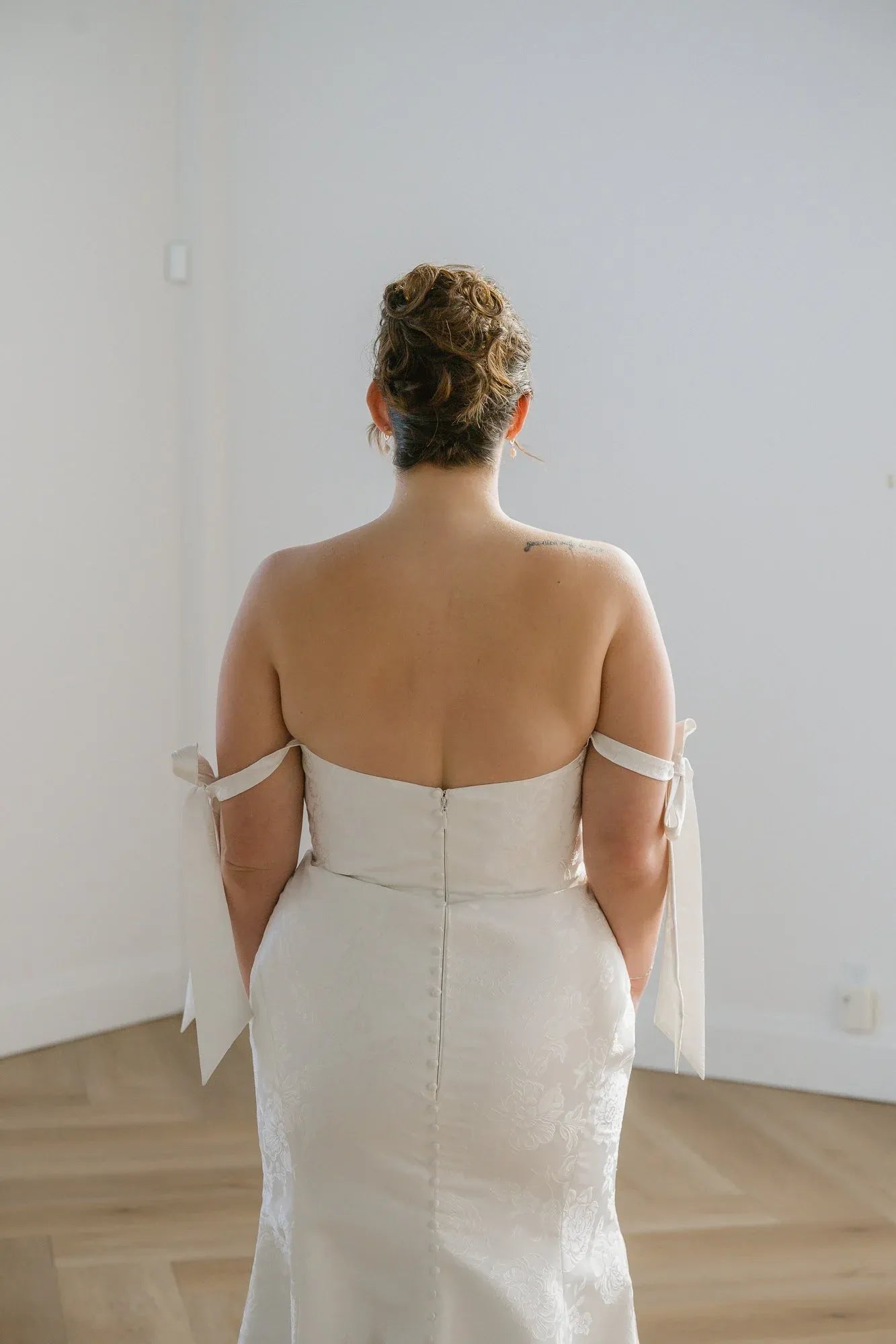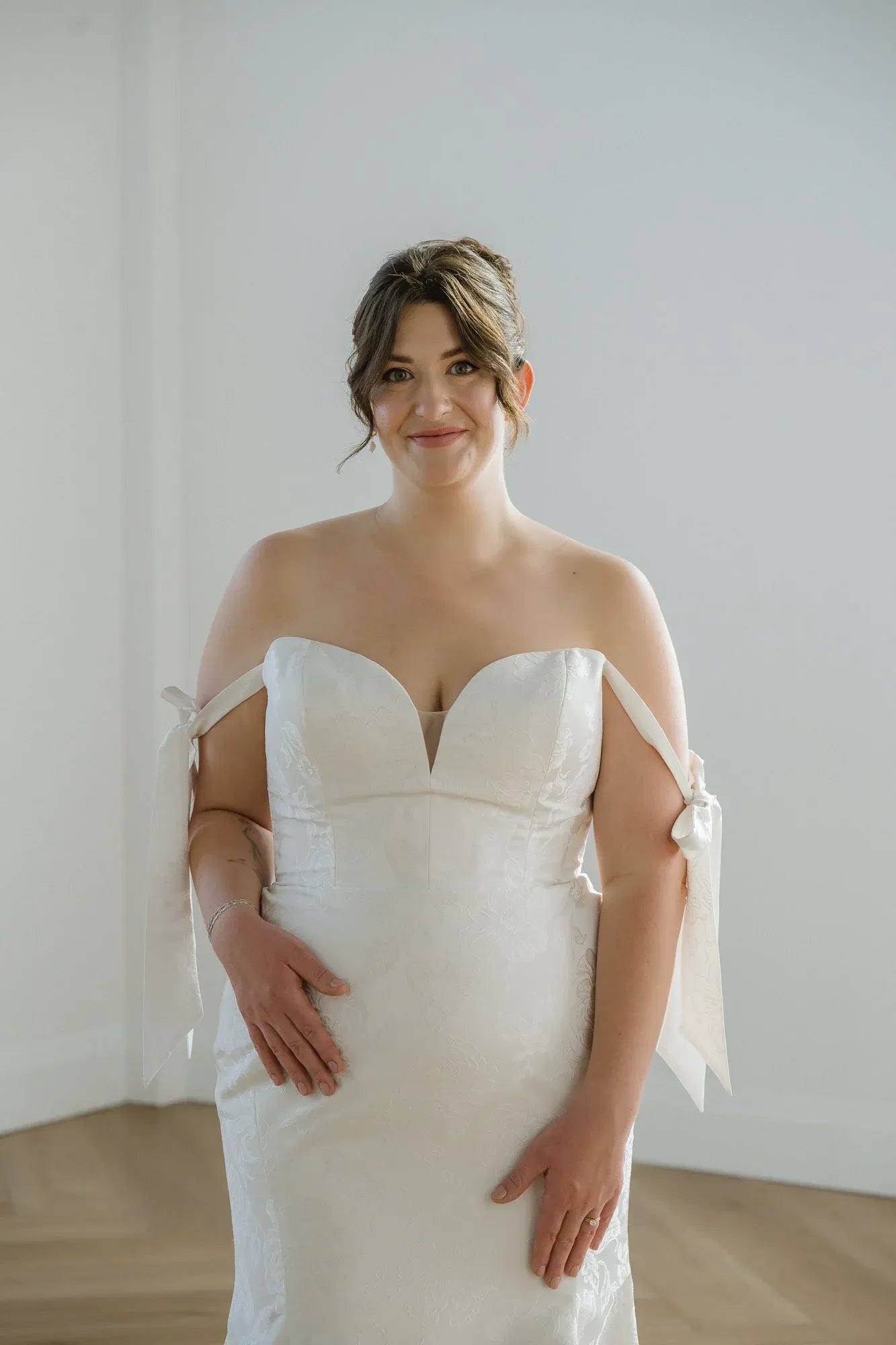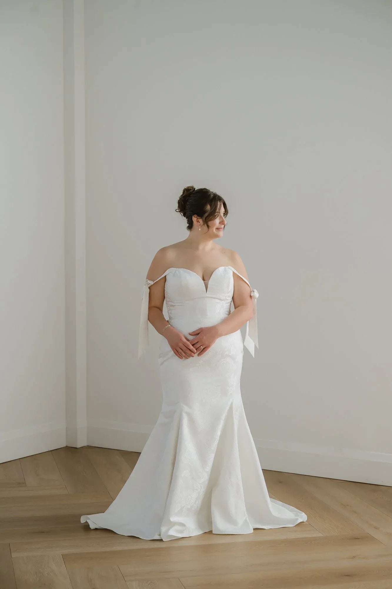 Butter mikado gown with sweetheart neckline, fit-to-flare skirt and detachable straps.
