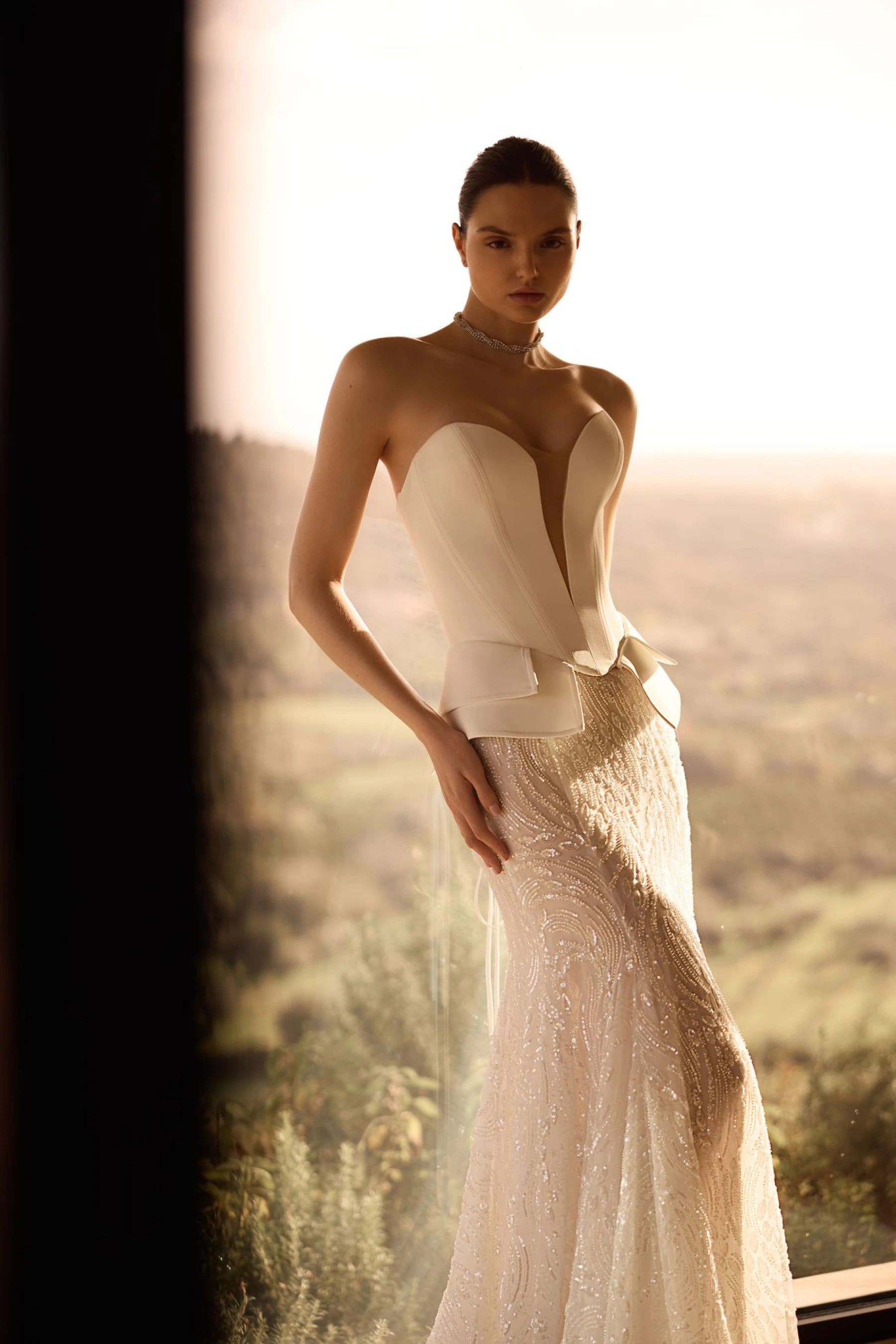 The corset is made of costume fabric with a deep V-neck and a curved bottom line. A decorative flying yoke made of costume fabric is sewn to the sides of the corset. It is fastened in the center of the back with grommets and lacing. You can complete the corset with skirts 1422T and Skirt 1006-S8172.