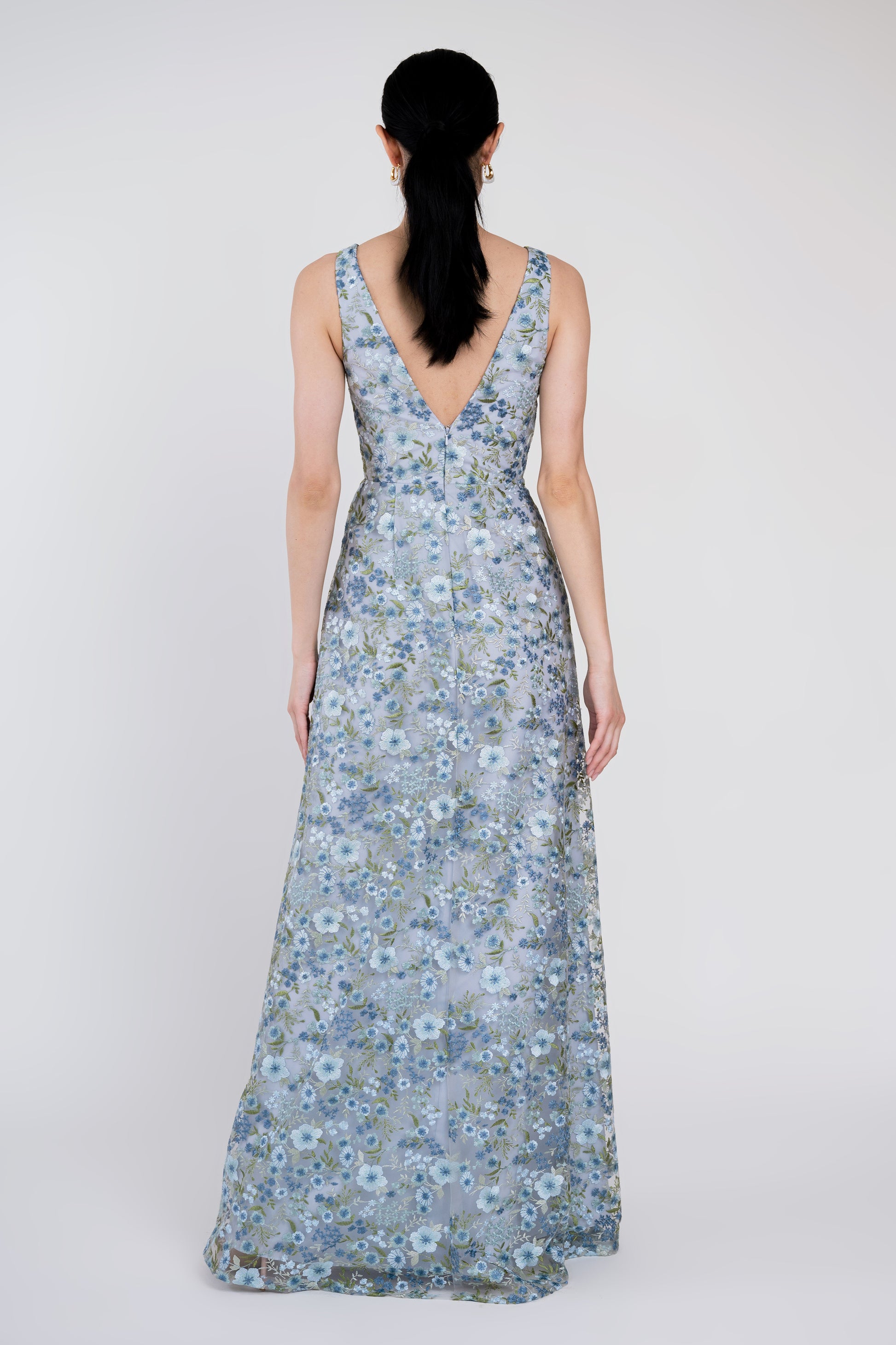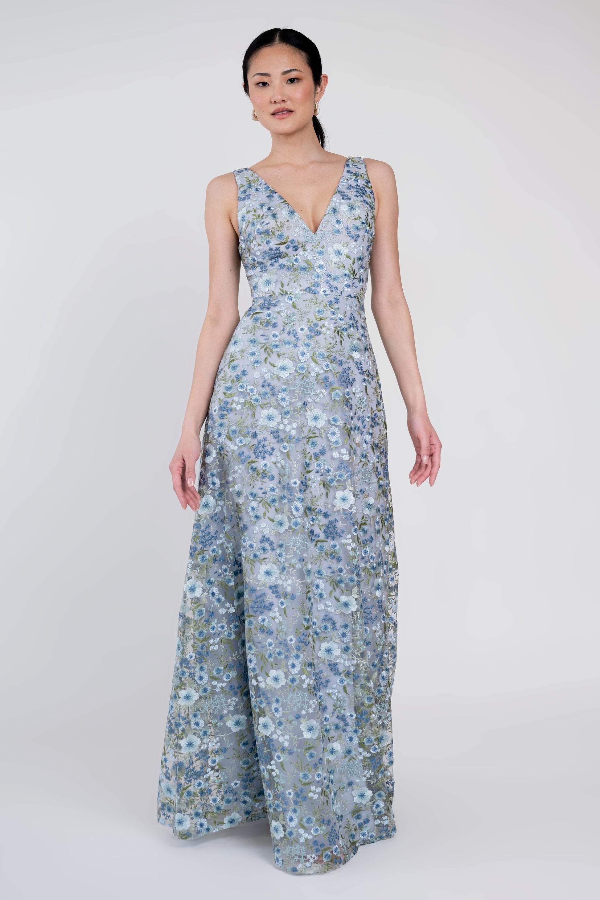 The Tatum V-neck bridesmaid dress features wide straps, a fitted bodice and a slim A-line skirt. Cut in our intricately embroidered Ophelia embroidered tulle fabric, this style is classically romantic.