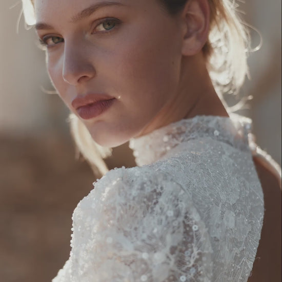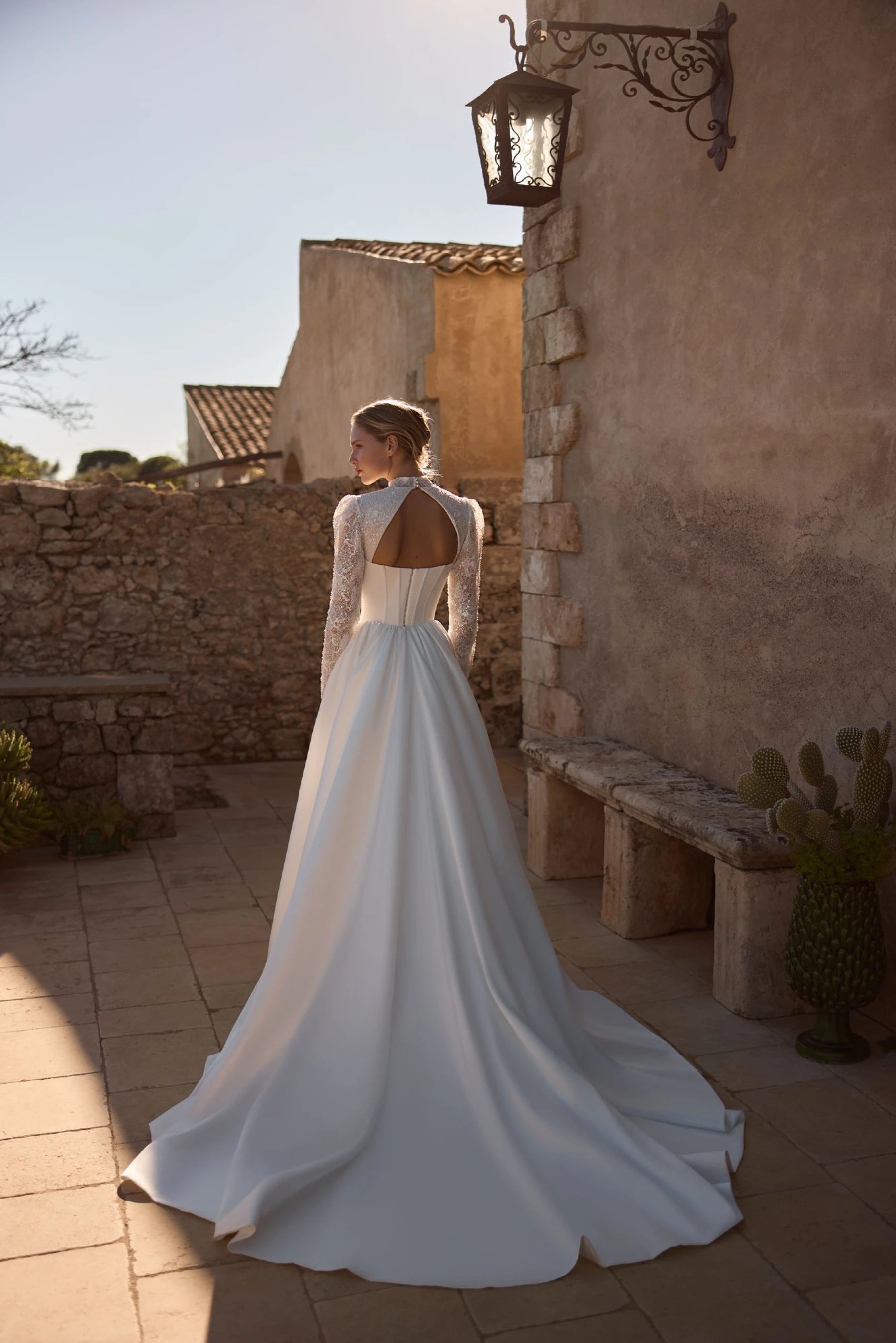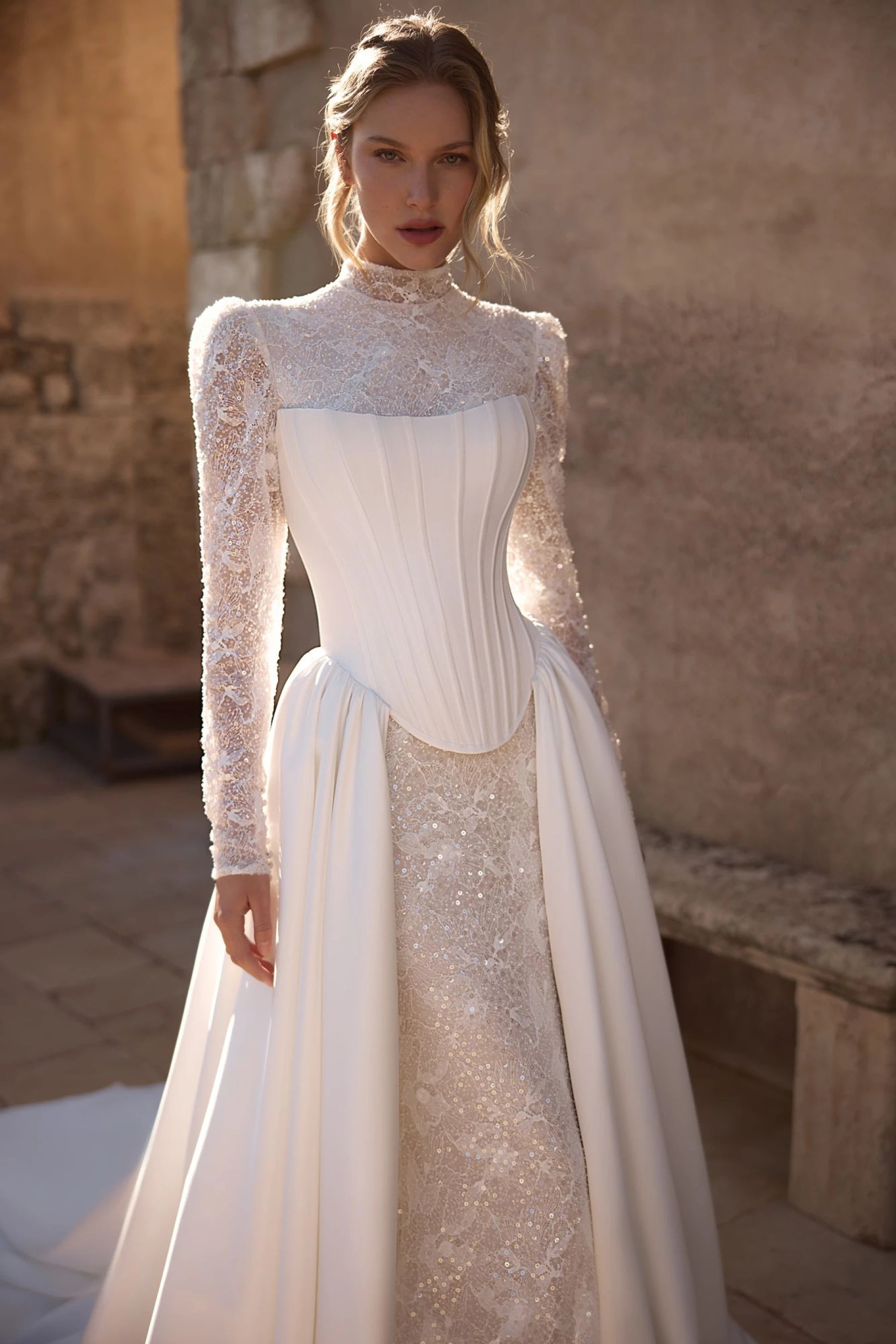 This sophisticated lightskin fishtail dress is embellished with lace. The dress's corset is constructed with a stand-up collar. The area from the shoulder blades to the waist is exposed, and the back of the corset is shaped like a "drop" in the top portion. Loops and buttons secure the corset in the middle of the back. The corset has long lace sleeves stitched into it. The skirt features an exquisite train, which is also composed of embroidered lace, and is form-fitting at the hips. In the middle of the rear panel is the concealed zipper closing. There is also an ivory version of this dress. Wearing this wedding gown, the bride will seem incredibly touching.